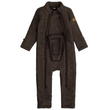 Den lukkes foran med to lynlåse, som går fra halsen og ned til midt på begge ben.