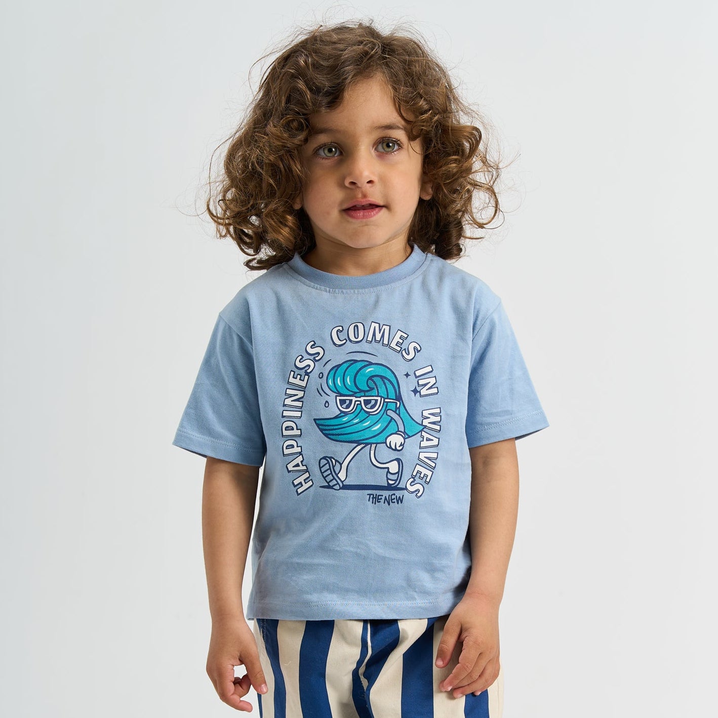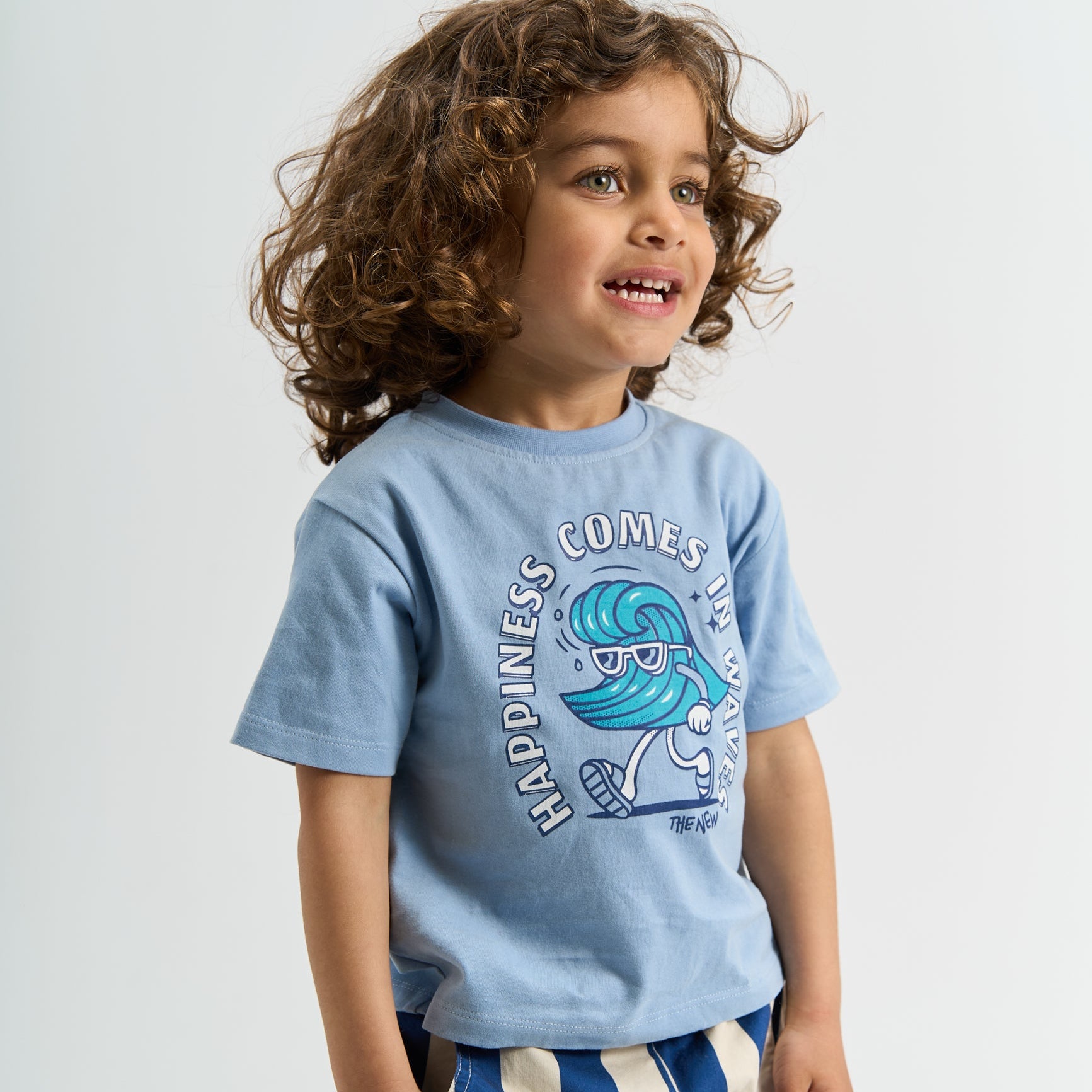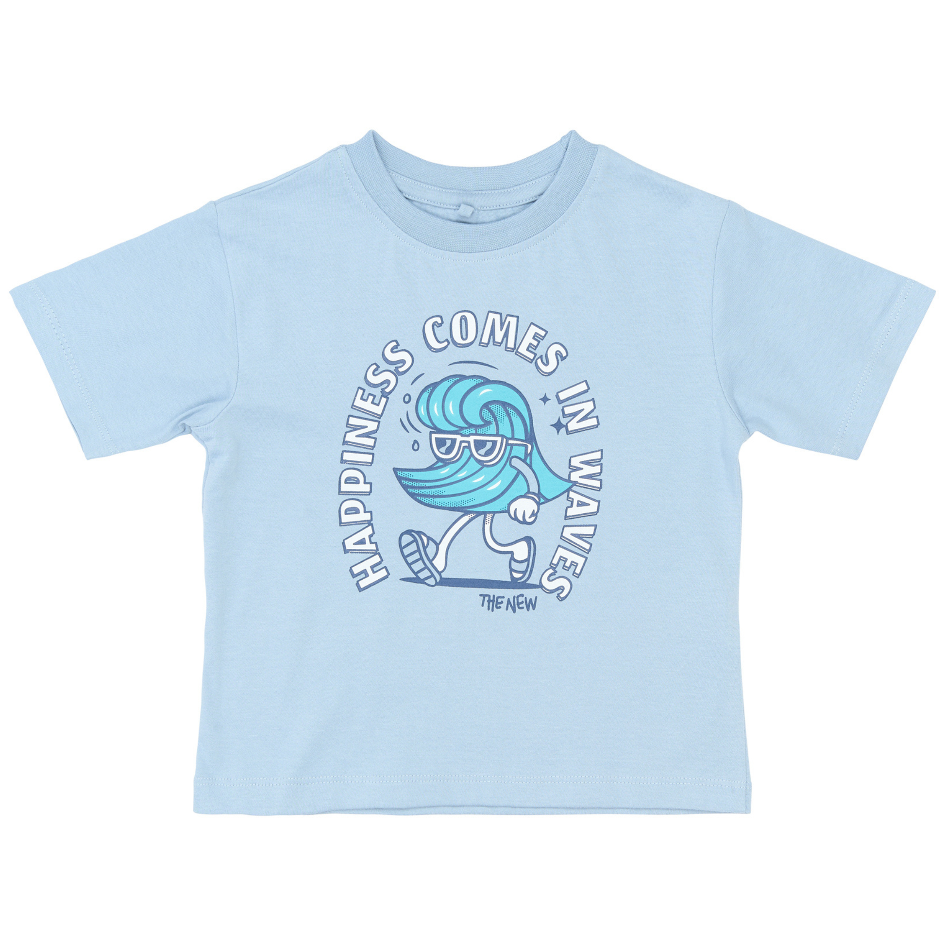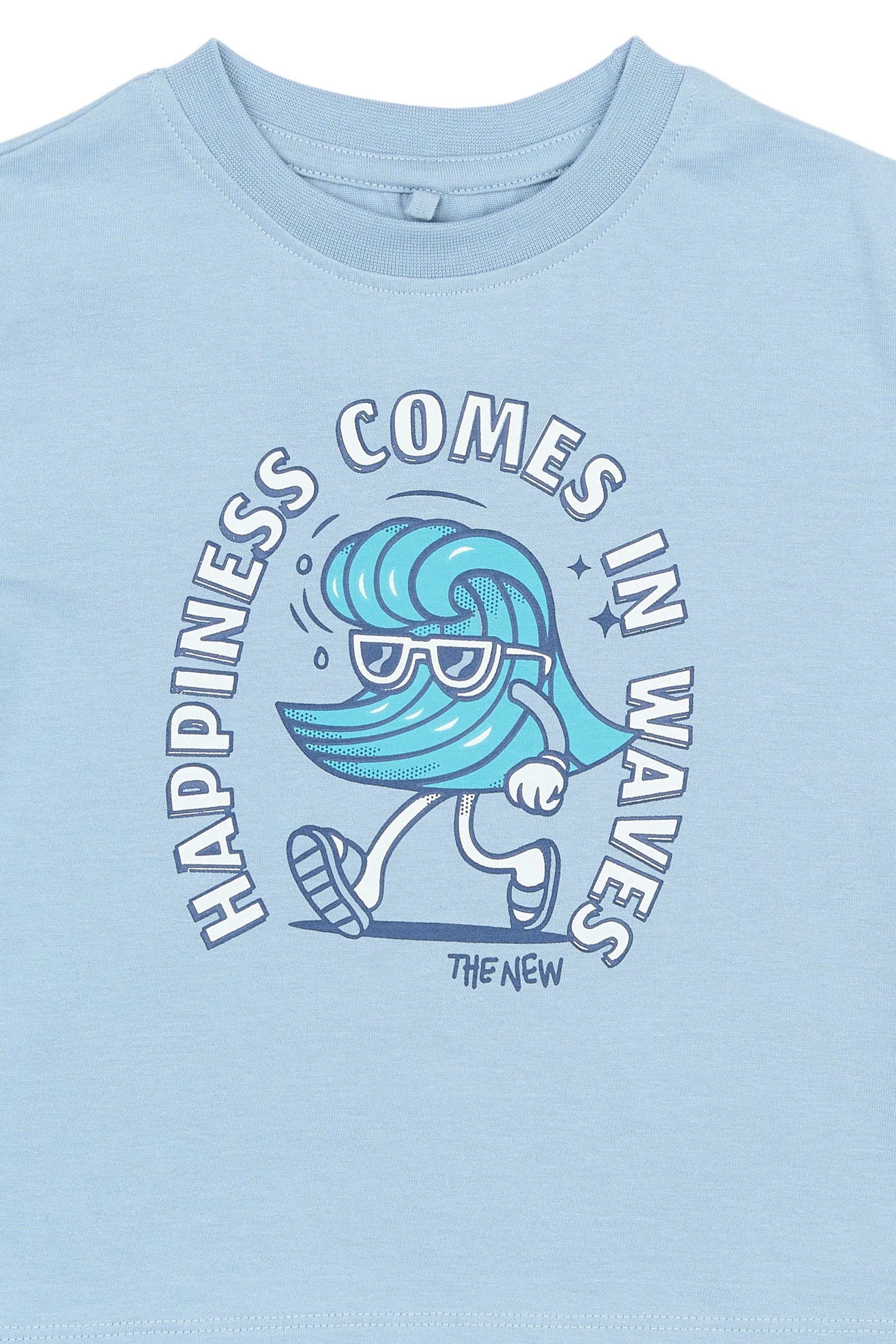 Denne i en fin støvet lyseblå farve med et sejt print på fronten af en gående bølge med solbriller og sandaler samt teksten; 'Happiness Comes In Waves'.