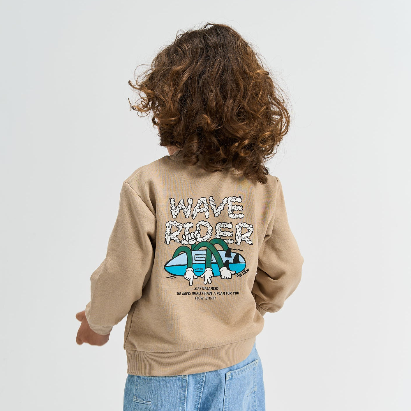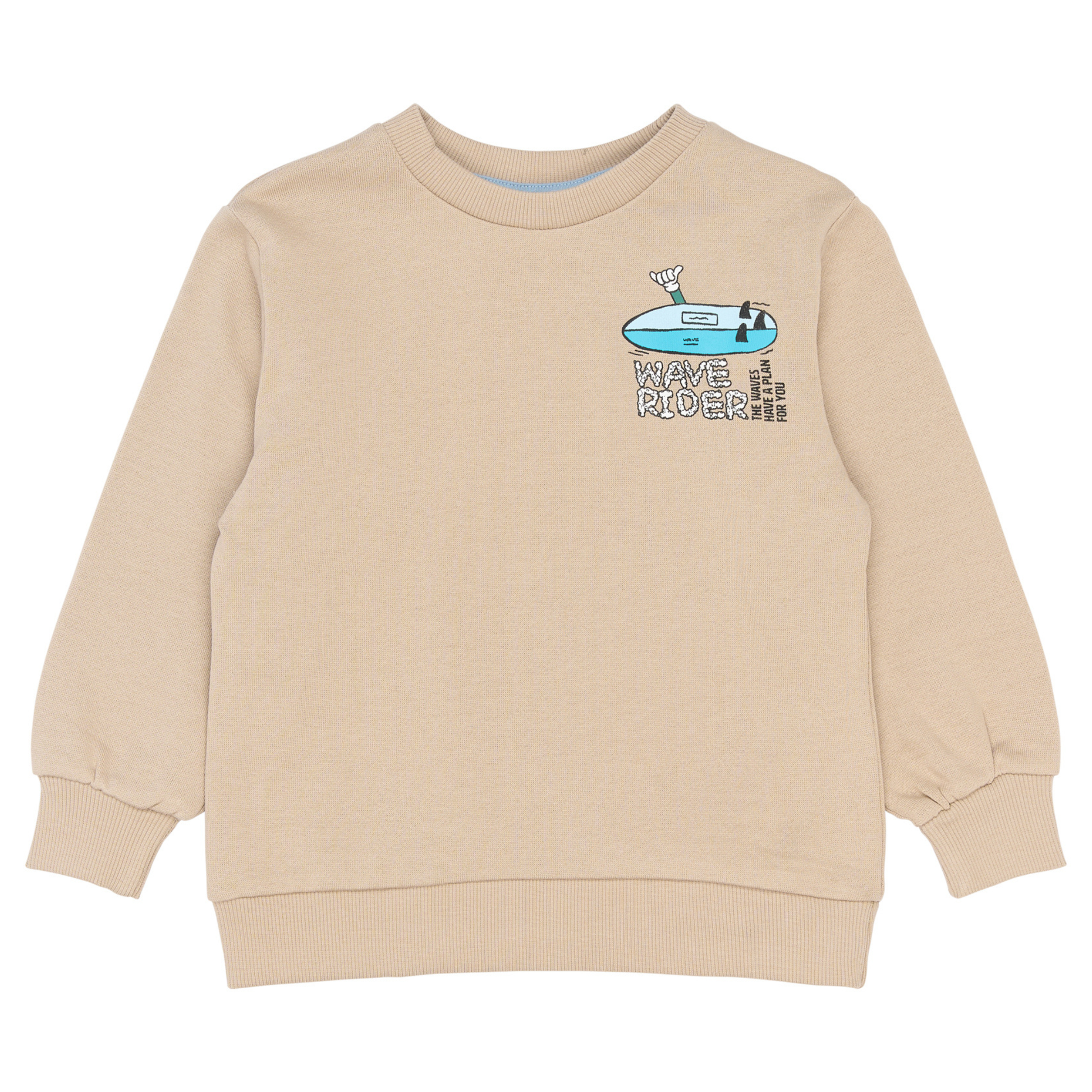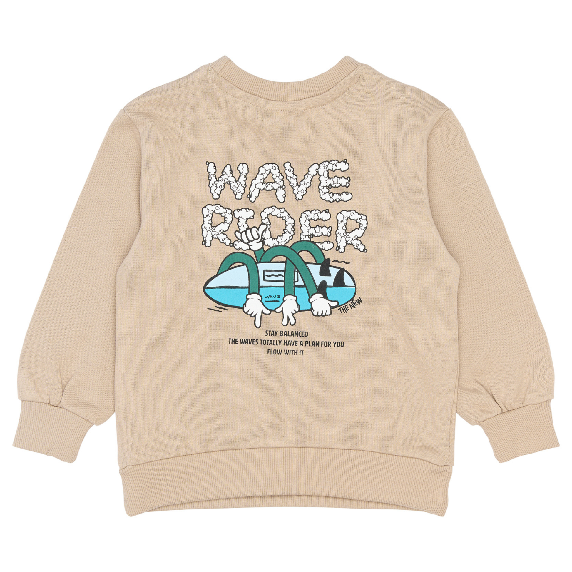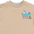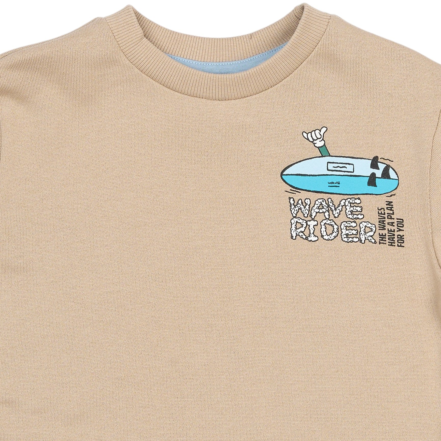 Denne i en flot mørk beige (mørk sand) farve med et print på venstre bryst af et surfbræt og teksten; 'Wave Rider - The Waves Have A Plan For You' samt et stort print på ryggen af et surfbræt med arme omkring samt; 'Wave Raider - Stay Balanced - The Waves Totally Have A Plan For You - Flow With It'.