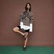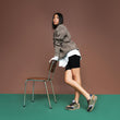 Denne i en flot multi farvet kombination i genanvendt tekstil i olivengrøn med detaljer i sort, lys og mørk brun og lilla ruskind, mørk petroleumsblå skind øverst på hælkappen, lys brun fiskeskind samt brun inderside med sål i lilla, olivengrøn og natur.