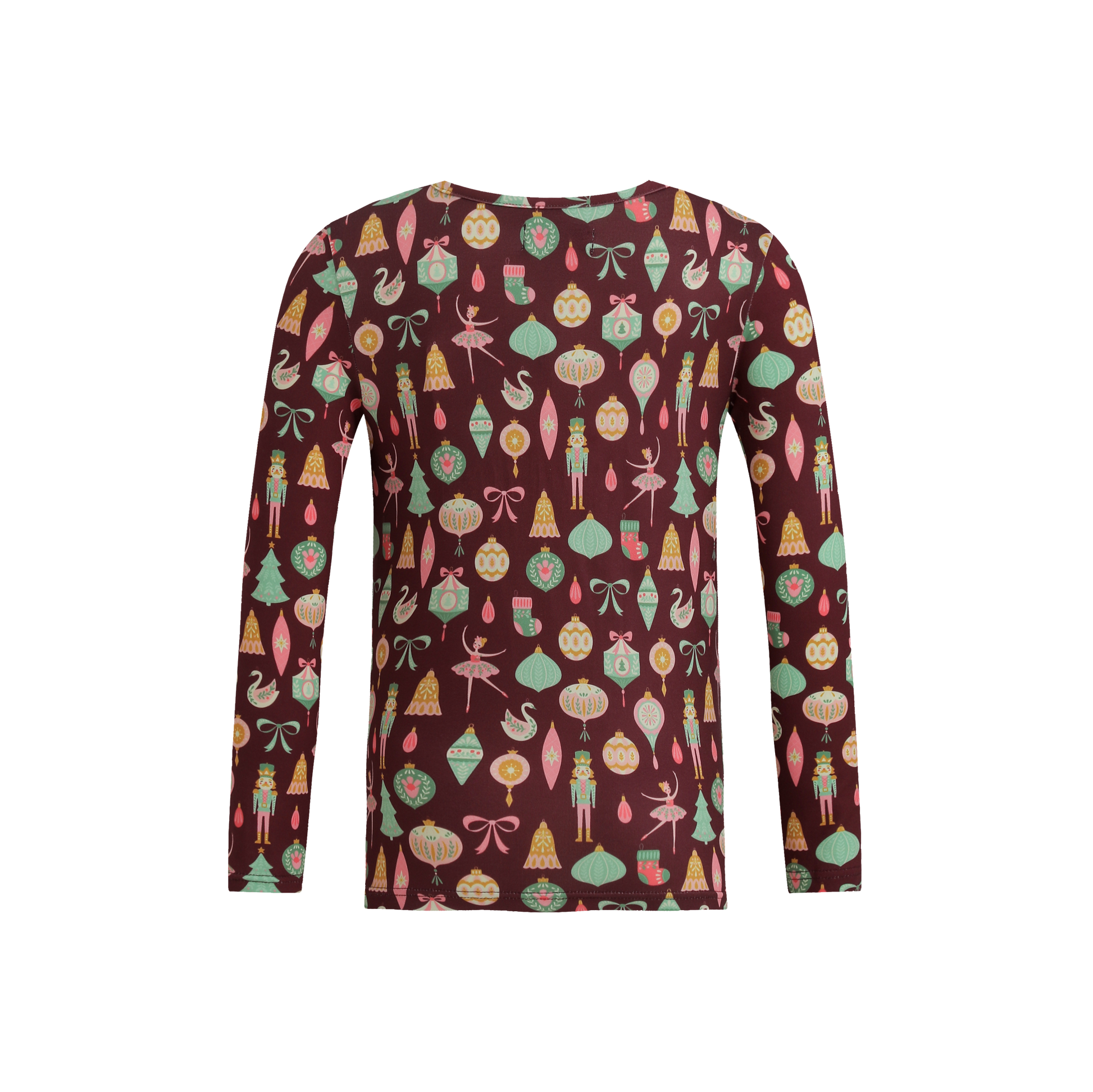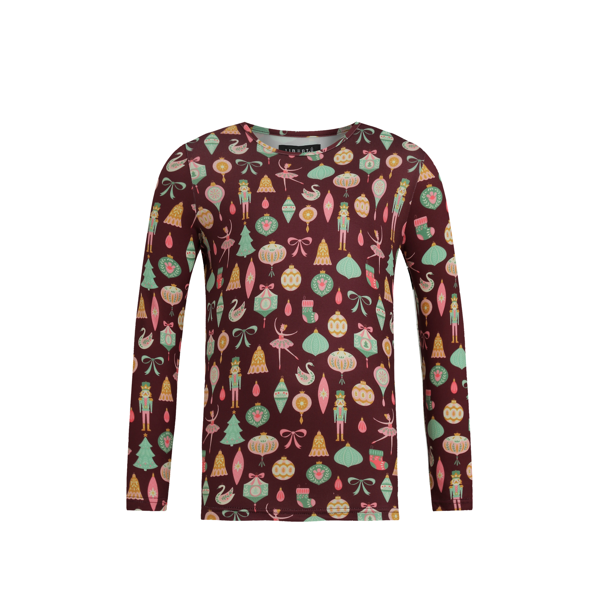 Denne i en flot mørk bordeaux farve med et fint juleprint over det hele af ballerinaer, soldater (nøddeknækker), svaner, julekugler og andet julepynt.