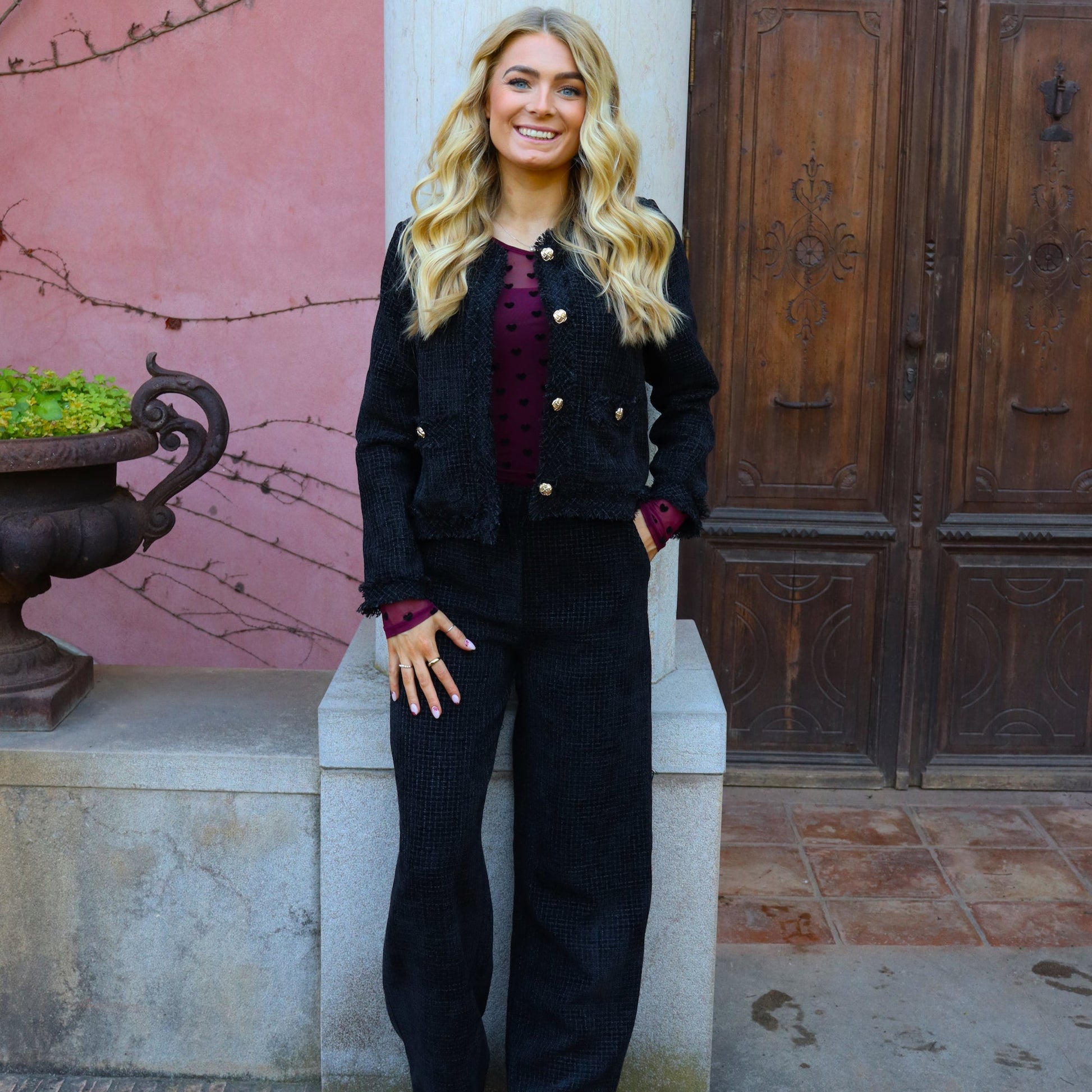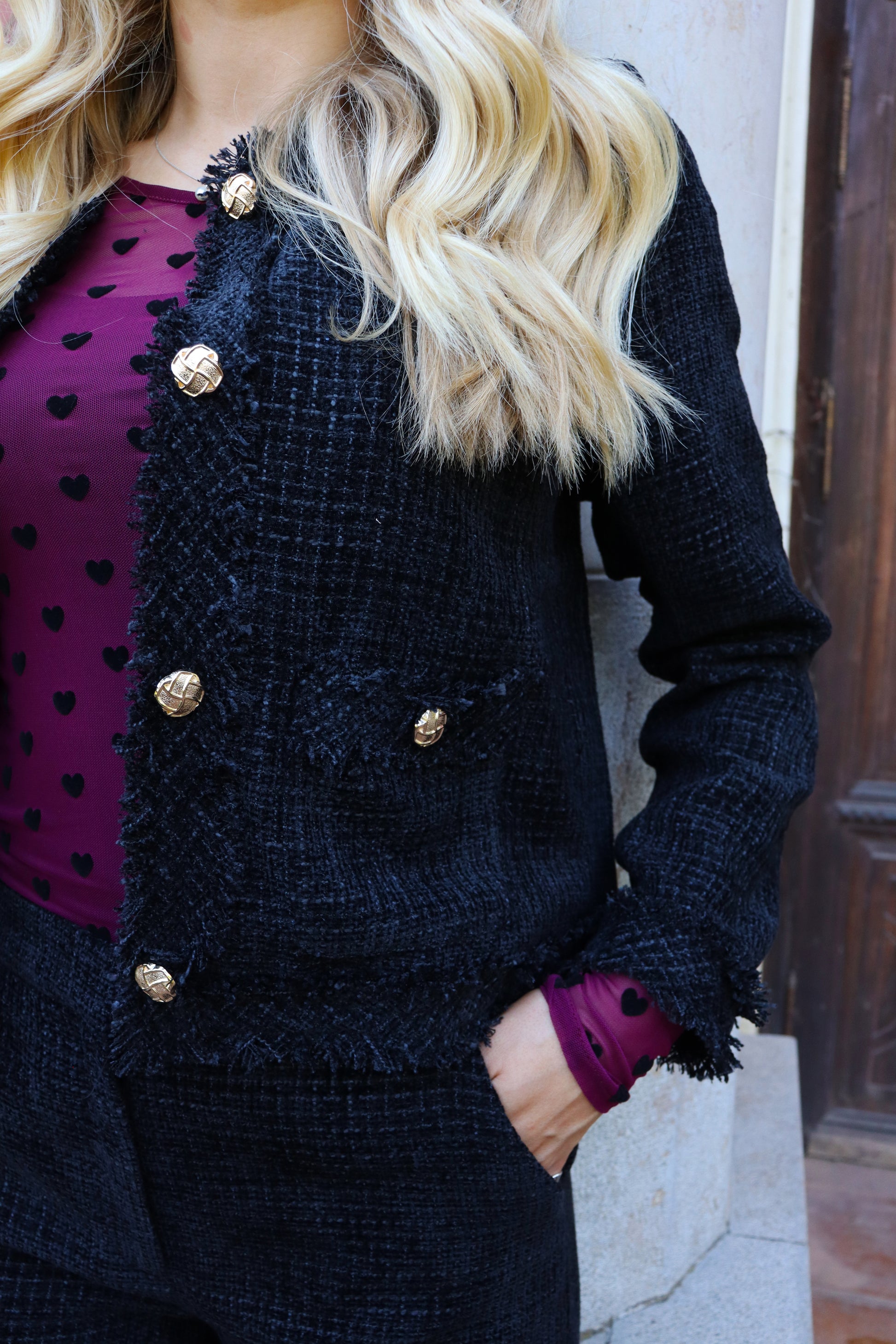 Denne i en klassisk sort meleret farve med sort lurex-tråde i stoffet, en blød, tweedlignende struktur og fine frynsekantede detaljer samt flotte guldfarvede knapper foran.