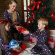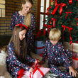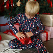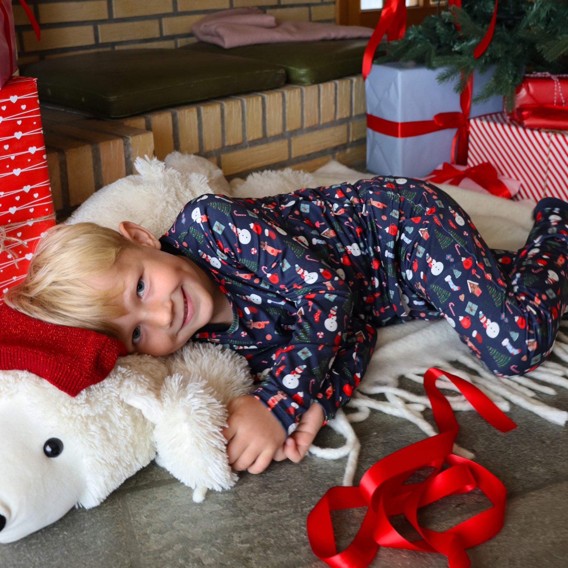 Denne i en skøn mørk blå farve med et fint juleprint over det hele af honningkage huse, snemand, rensdyr, juletræ og andet julepynt.