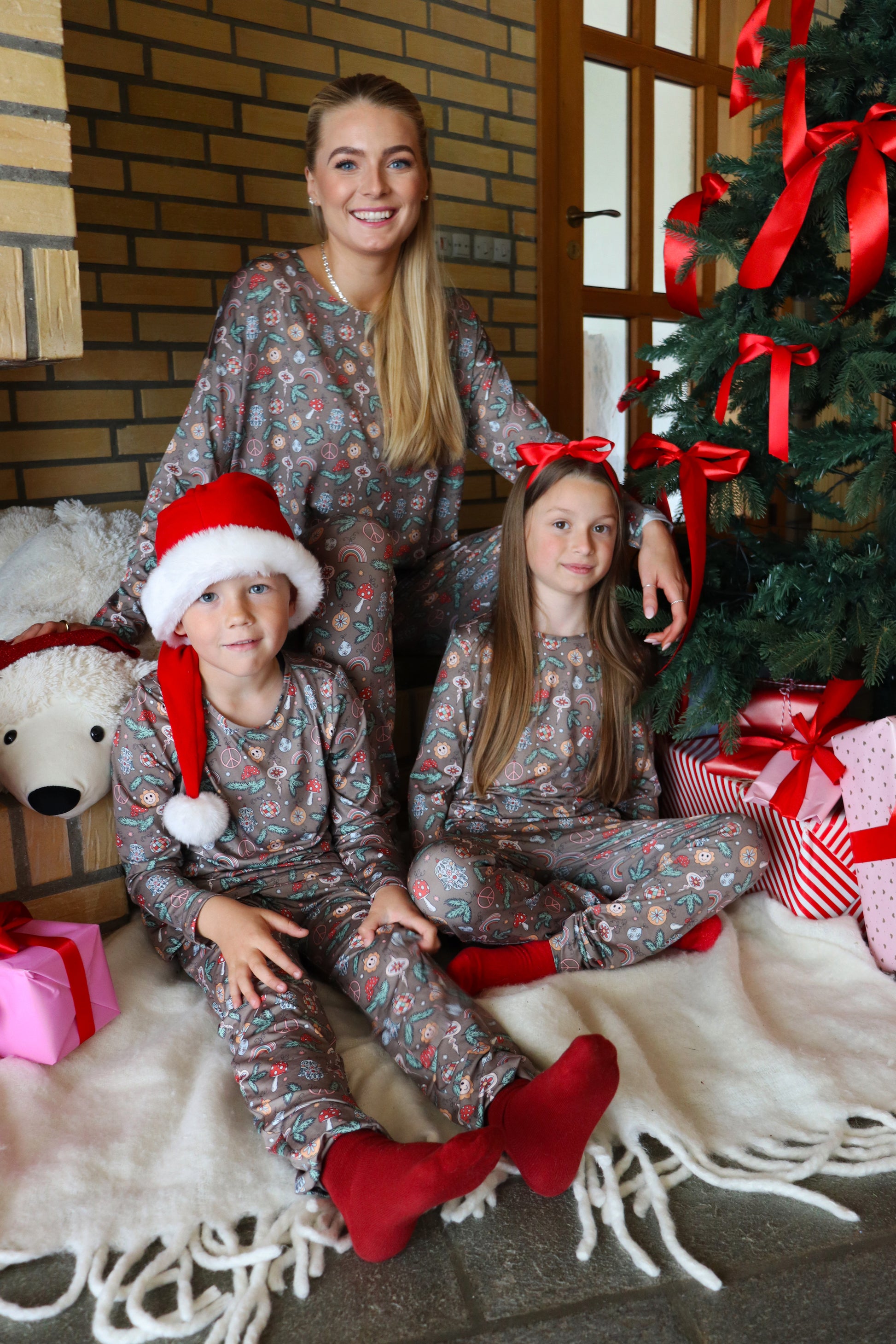 Denne i en fin lys brun farve med et skønt juleprint over det hele af fredsfyldt julepynt, champignoner og gran.