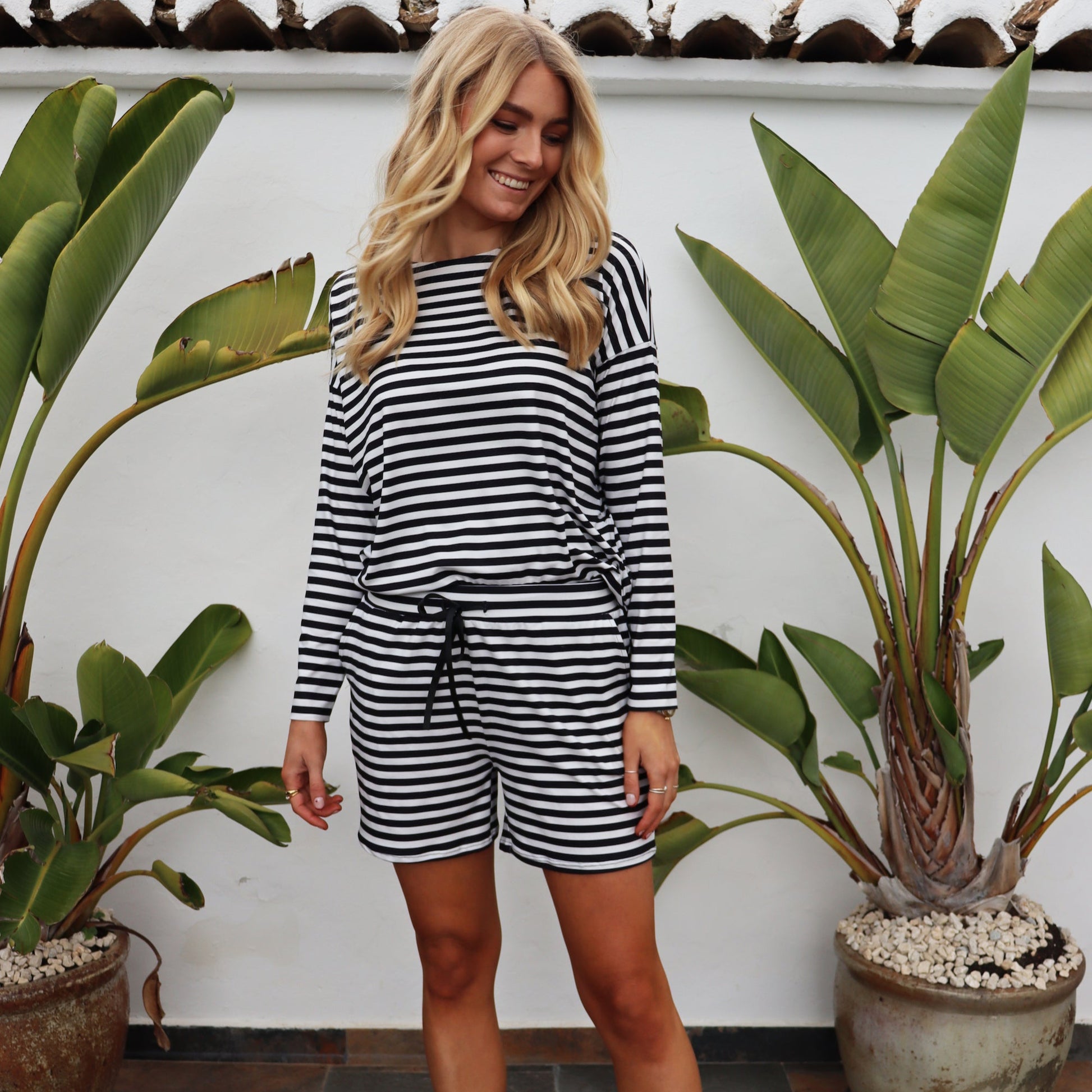 Disse i skønne striber i klassisk sort og råhvid.