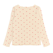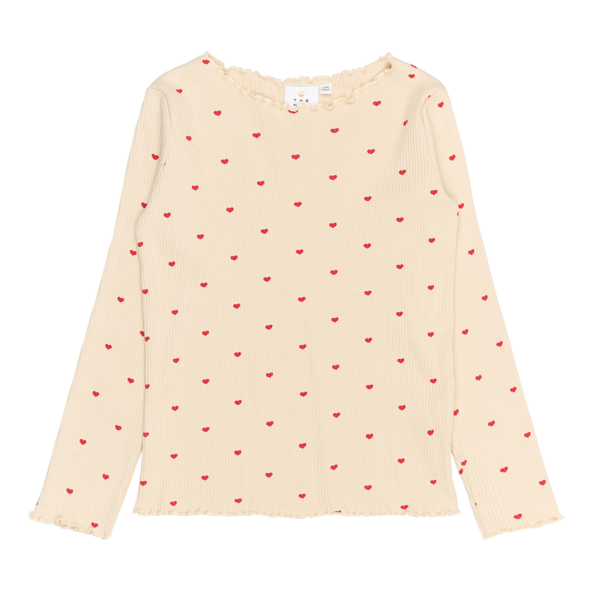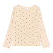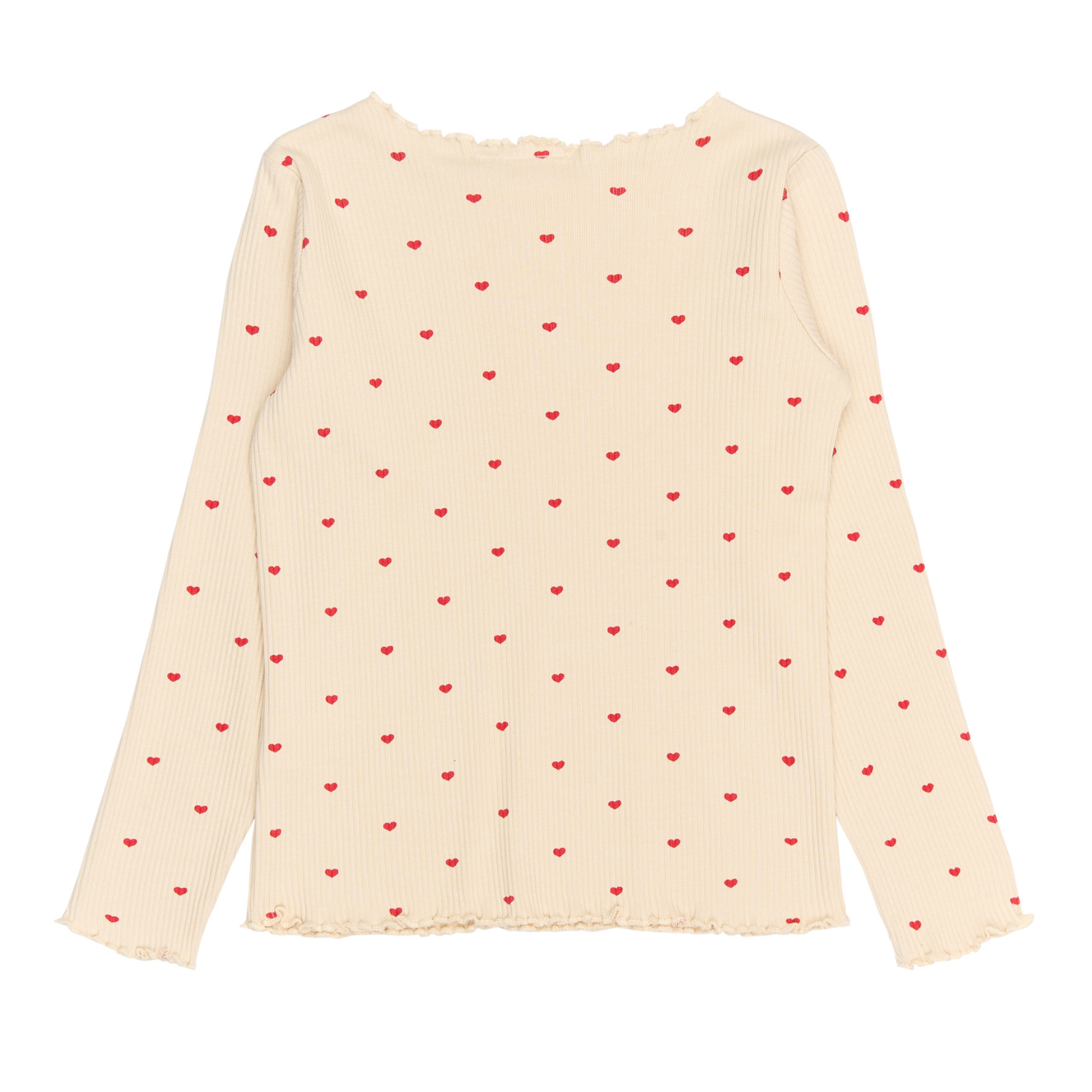 Dette i en fin råhvid farve med et charmerende heldækkende print af små hjerter og babylock-kanter, der sammen tilføjer et sødt og feminint touch.