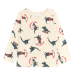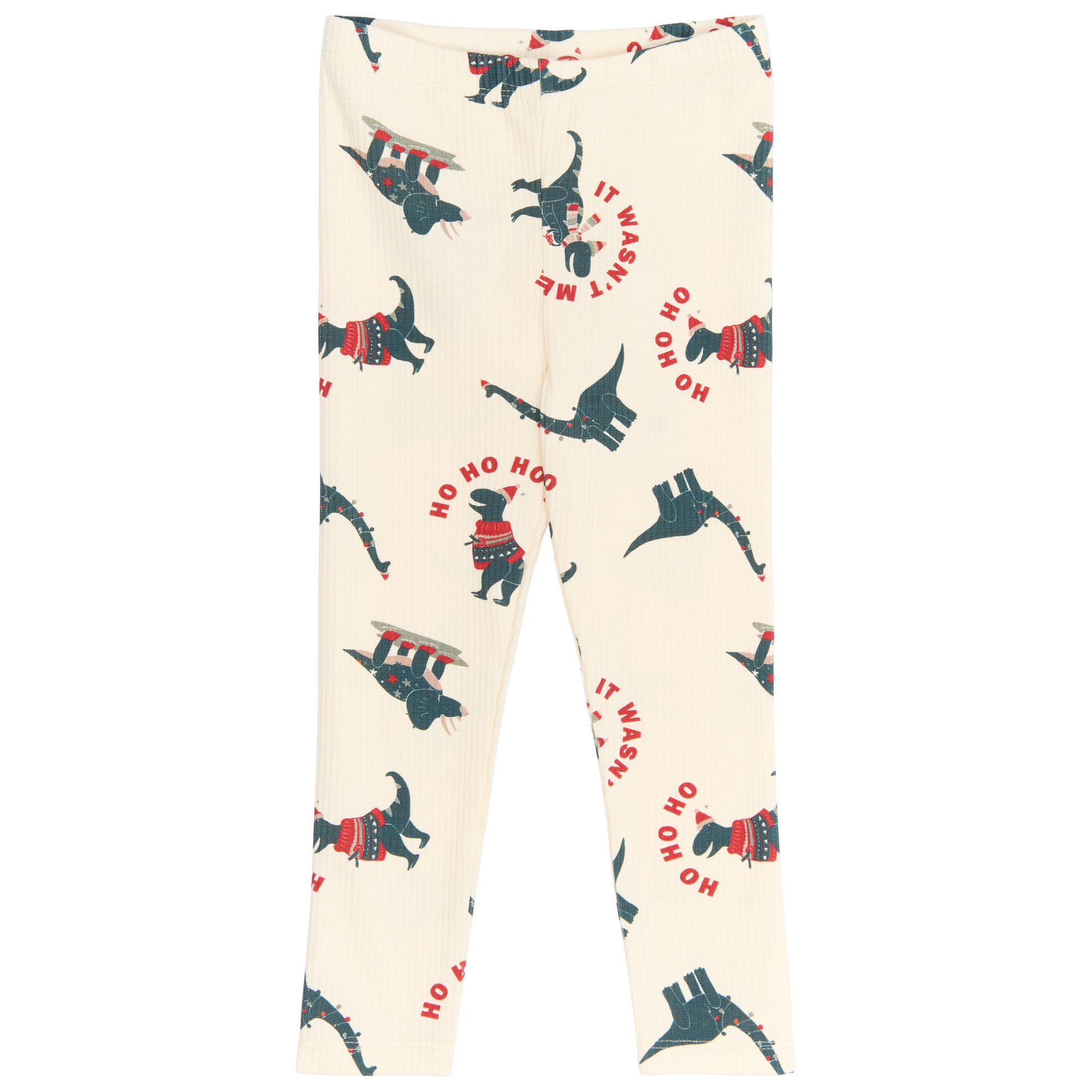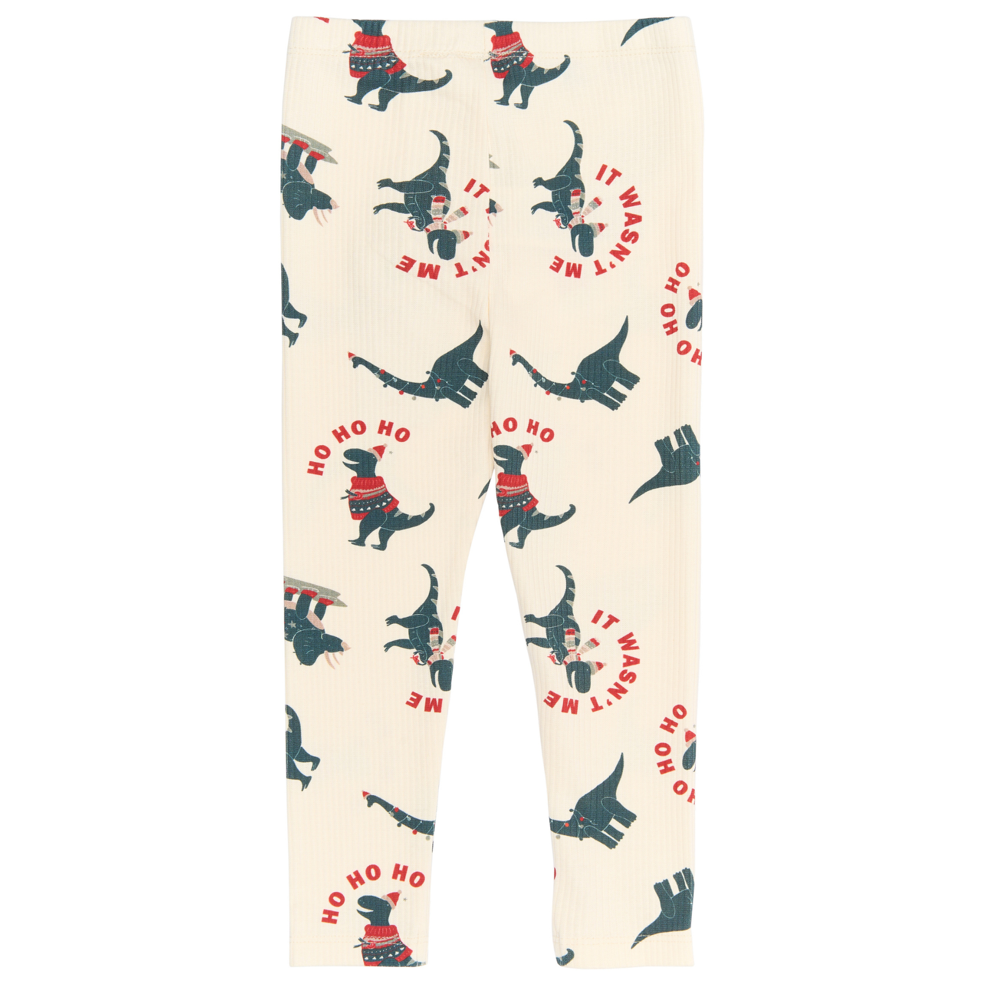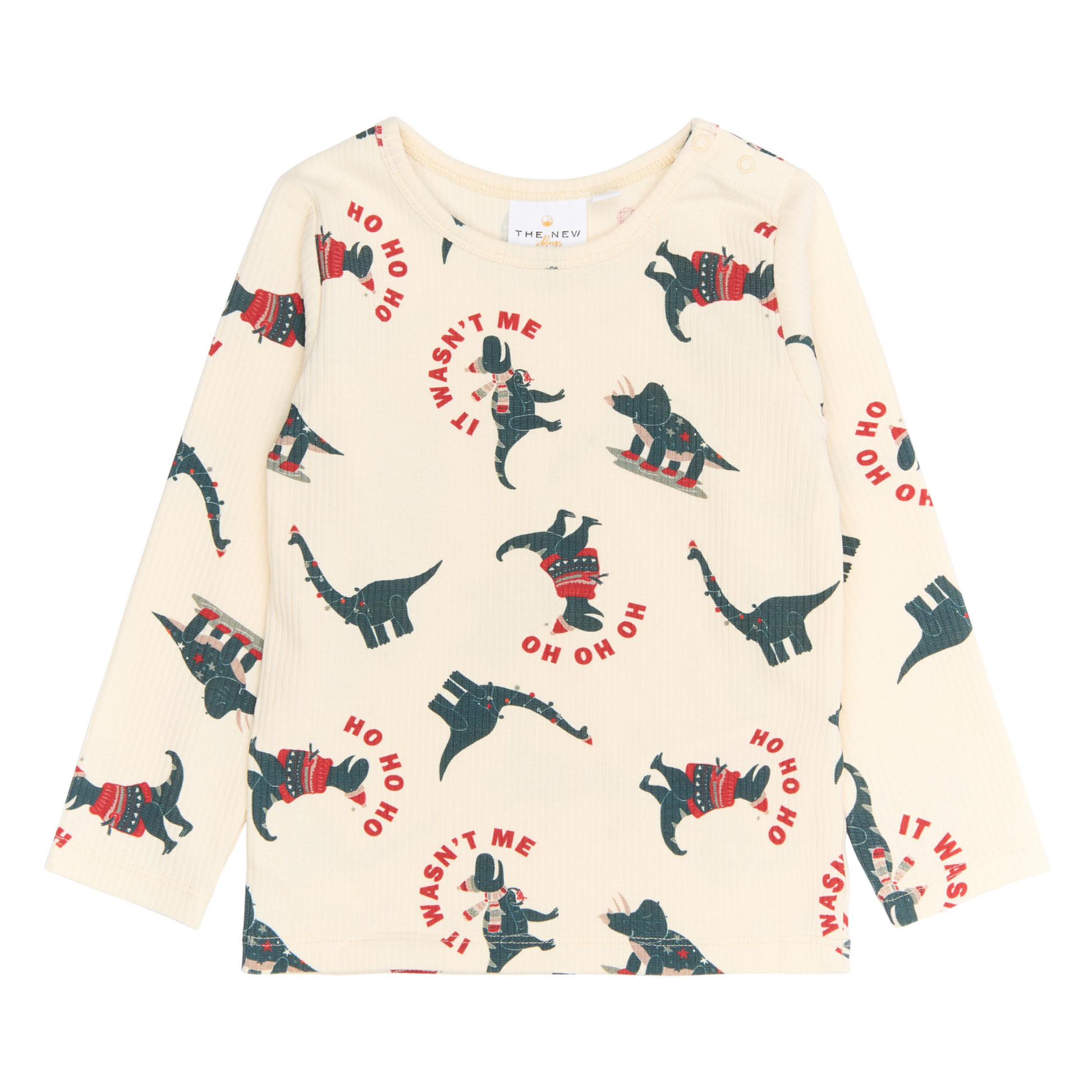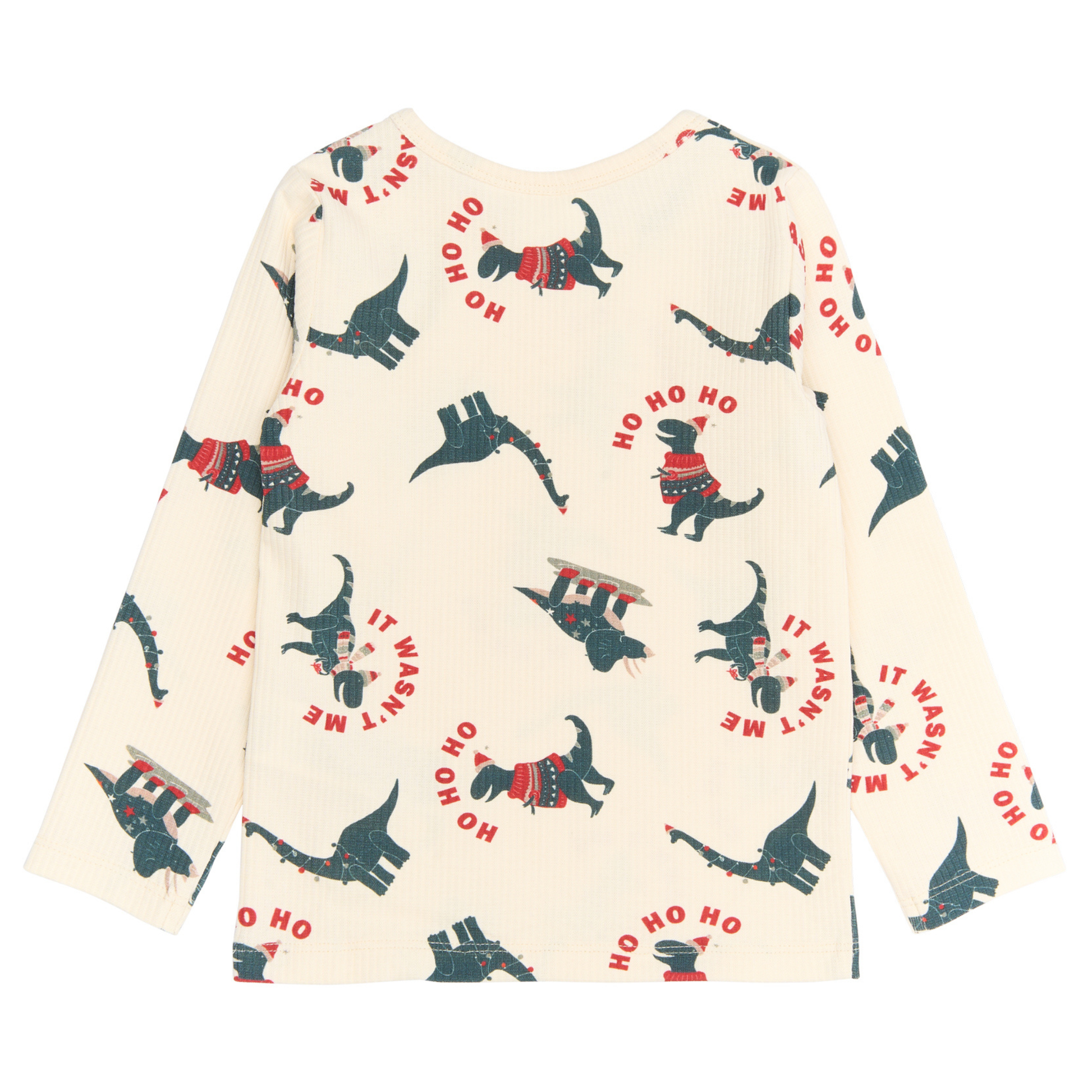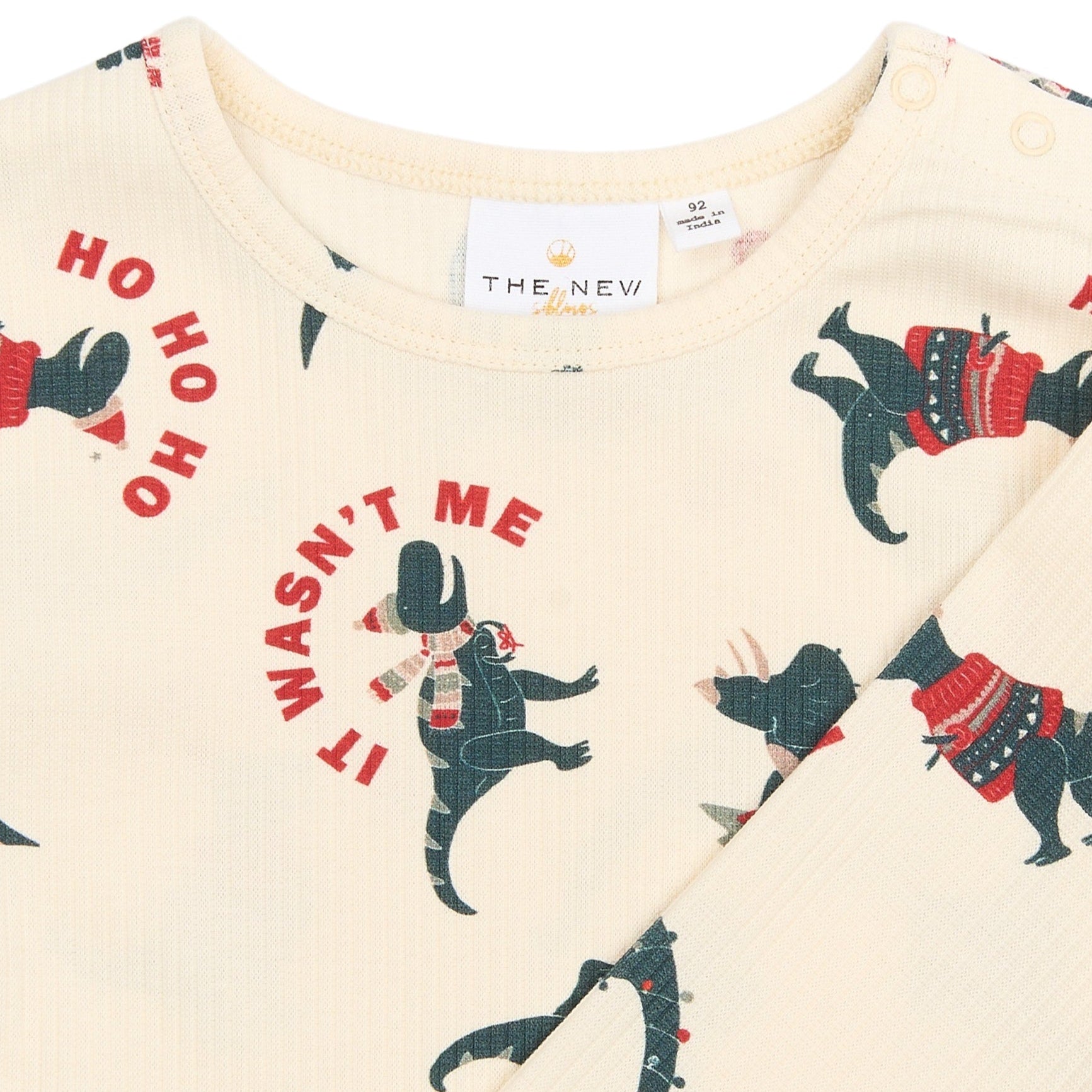 Dette i en fin råhvid farve med et cool juleprint over det hele med legesyge dinosaurer, hvor den ene har juletrøje på, mens de andre deltager i forskellige sjove aktiviteter. Tekster som 'Ho Ho Ho' og 'It Wasn't Me' tilføjer et humoristisk twist til designet.