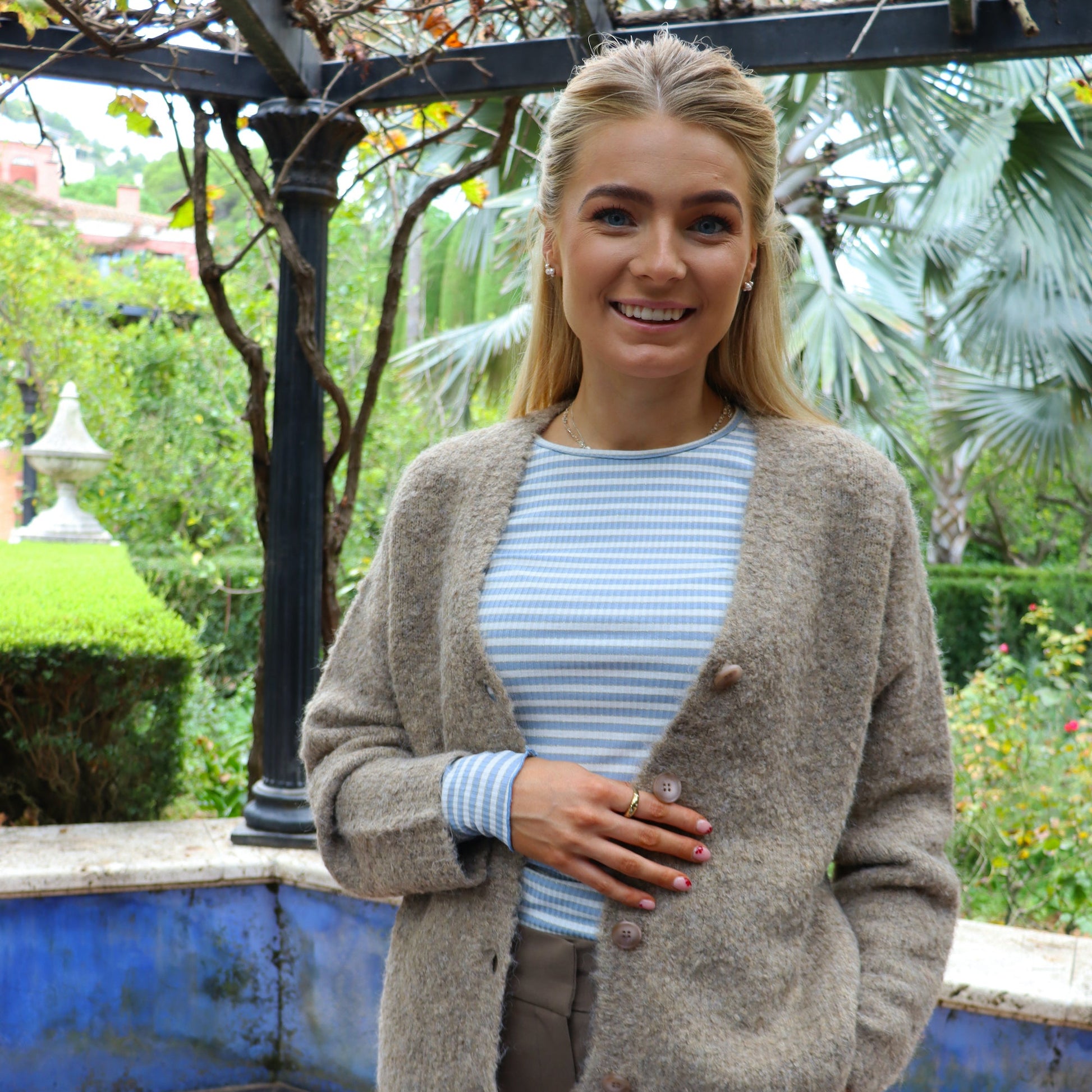 Denne i flotte striber i lyseblå, råhvid og smalle gyldne lurex striber.