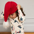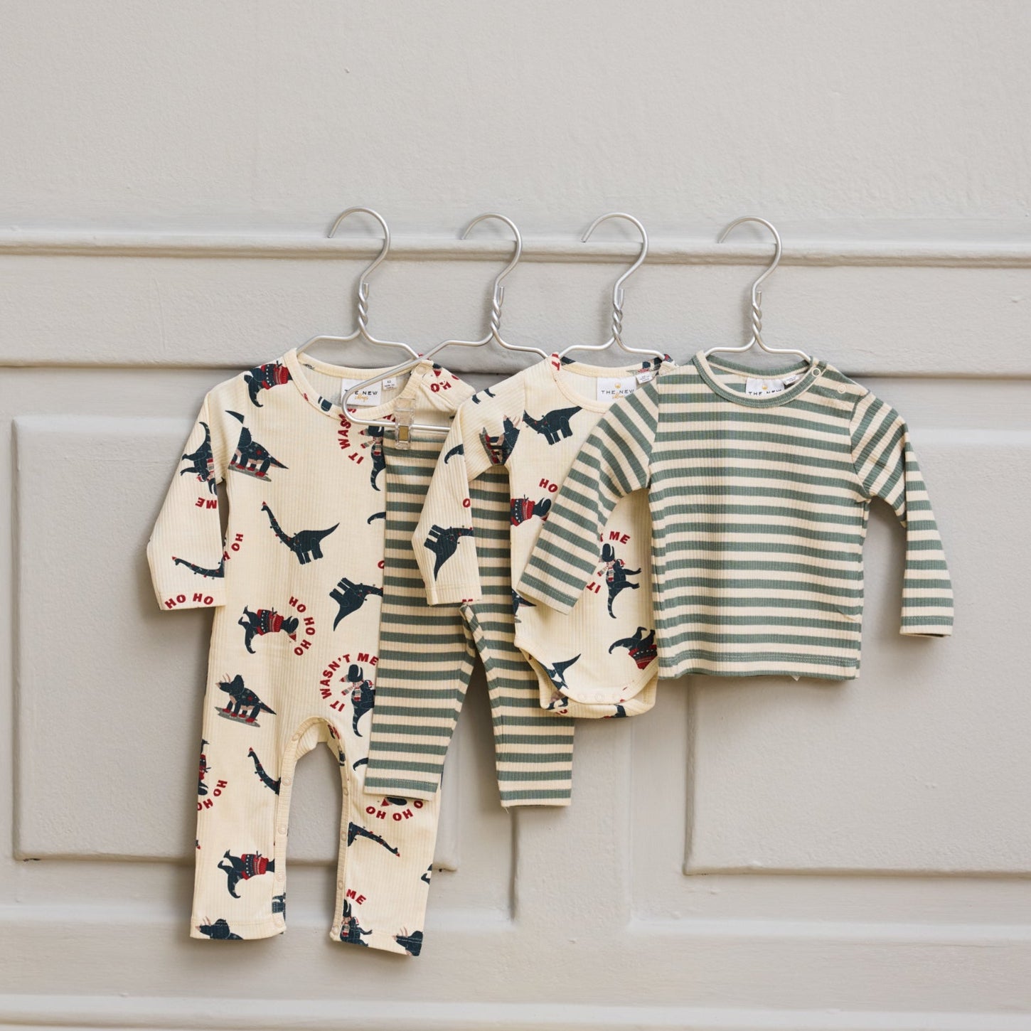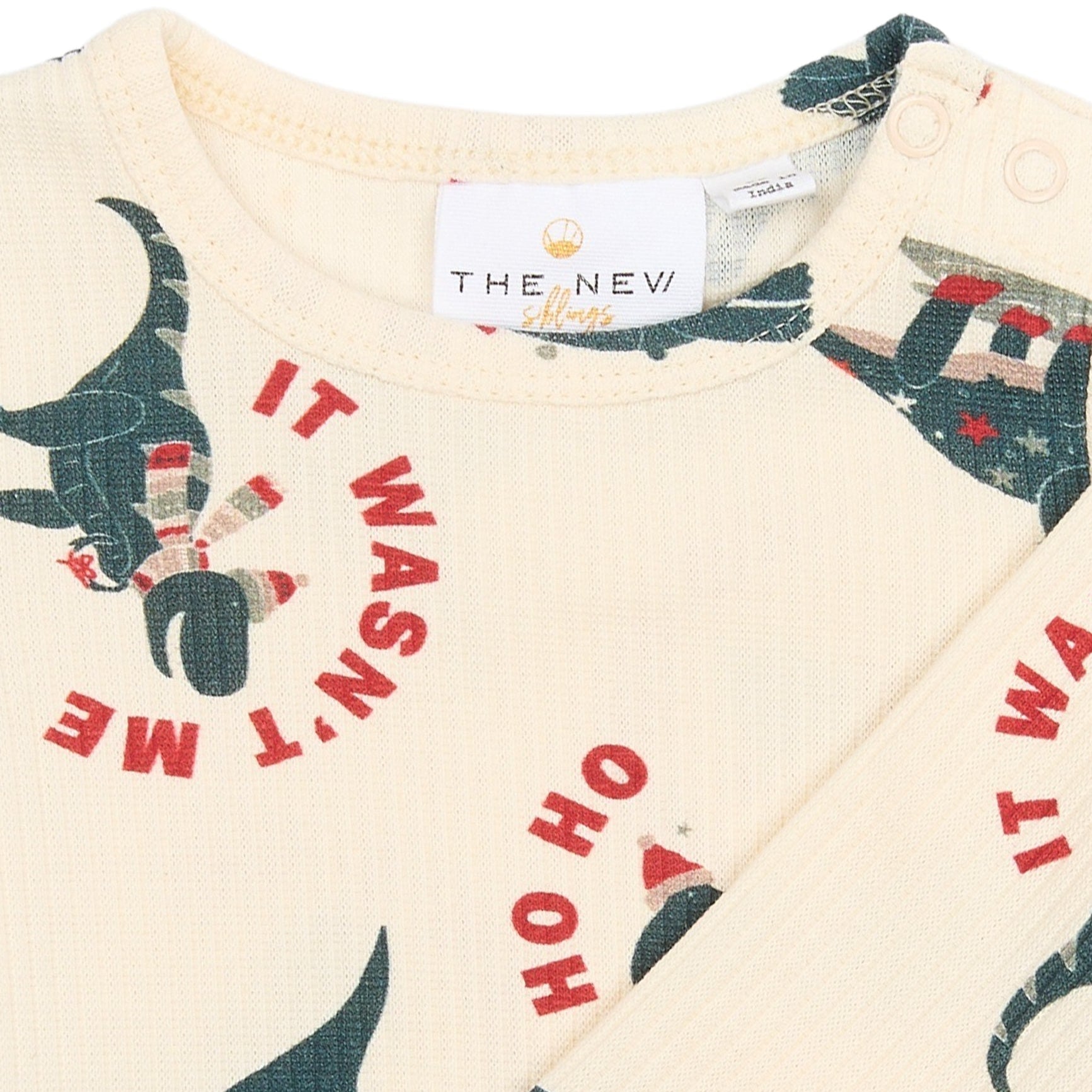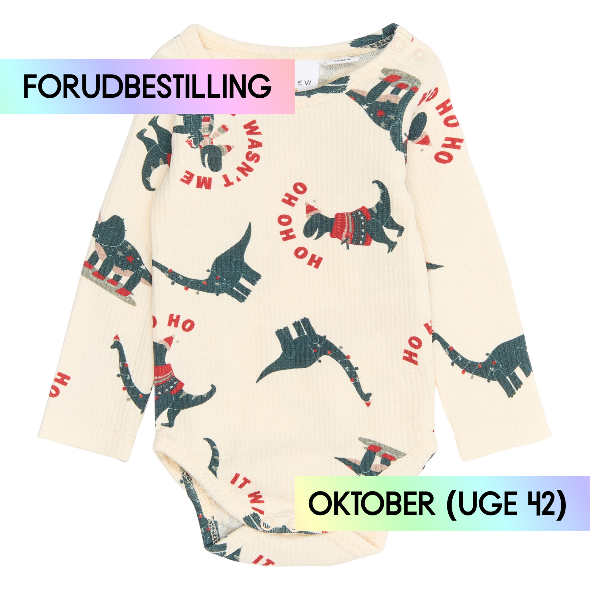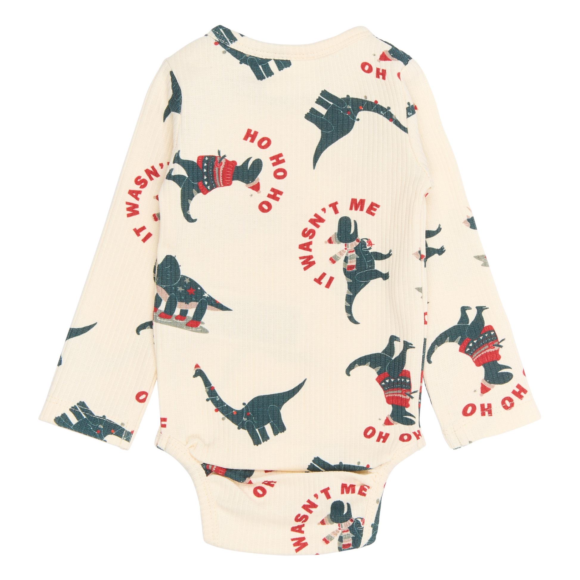 Denne i en fin råhvid farve med et cool juleprint over det hele med legesyge dinosaurer, hvor den ene har juletrøje på, mens de andre deltager i forskellige sjove aktiviteter. Tekster som 'Ho Ho Ho' og 'It Wasn't Me' tilføjer et humoristisk twist til designet.