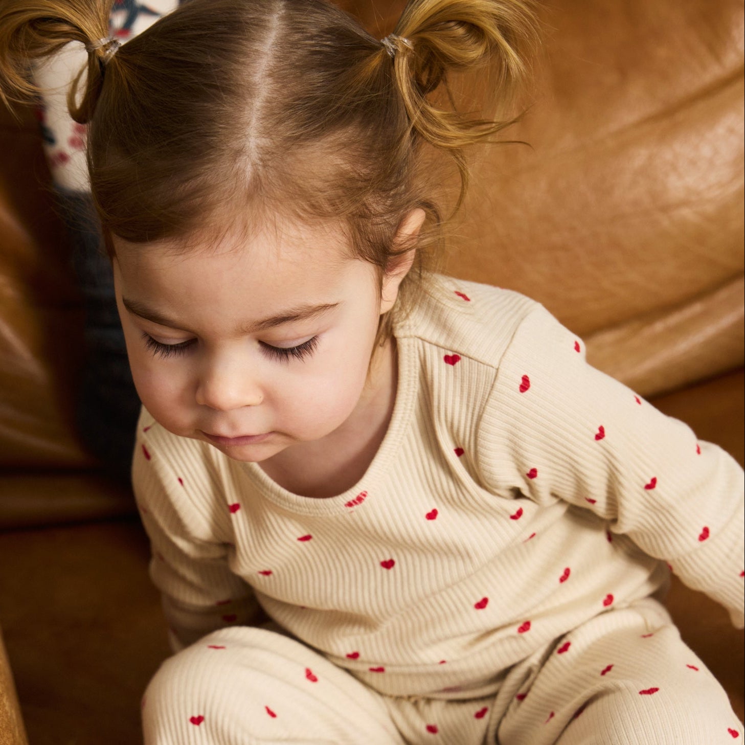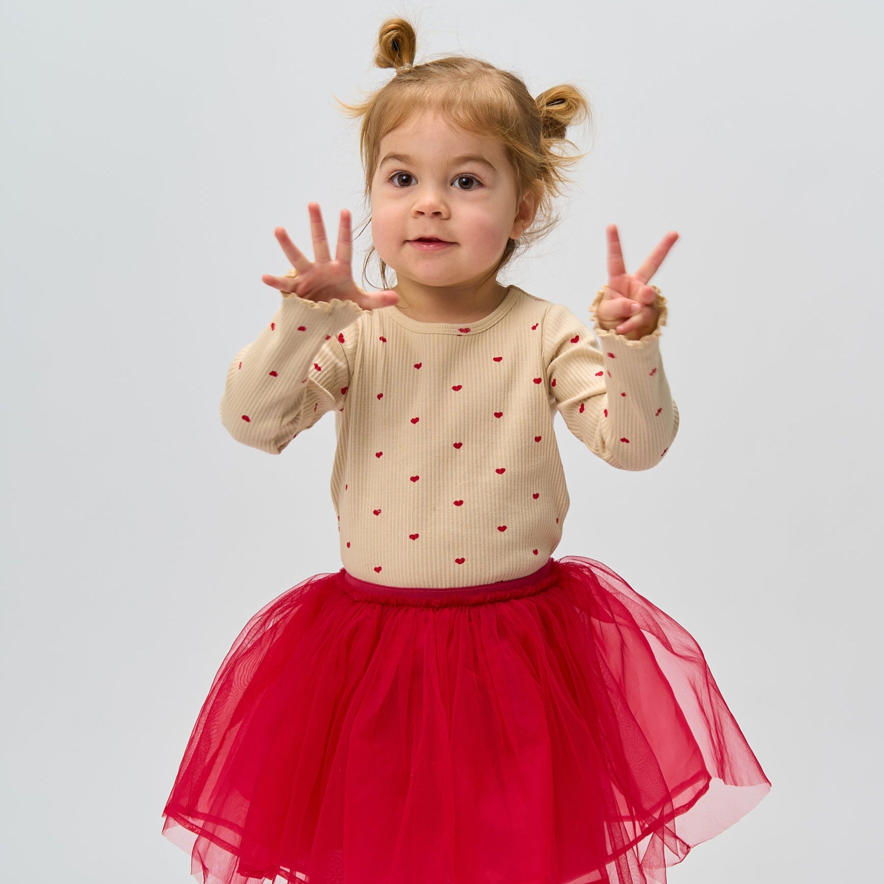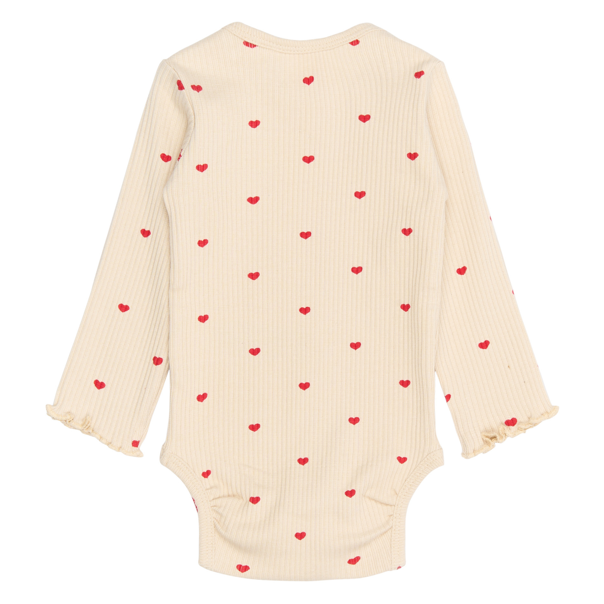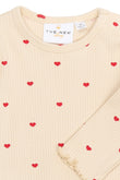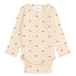 Denne i en fin råhvid farve med et charmerende heldækkende print af små hjerter og babylock-kant nederst i ærmerne, der sammen tilføjer et sødt og feminint touch.