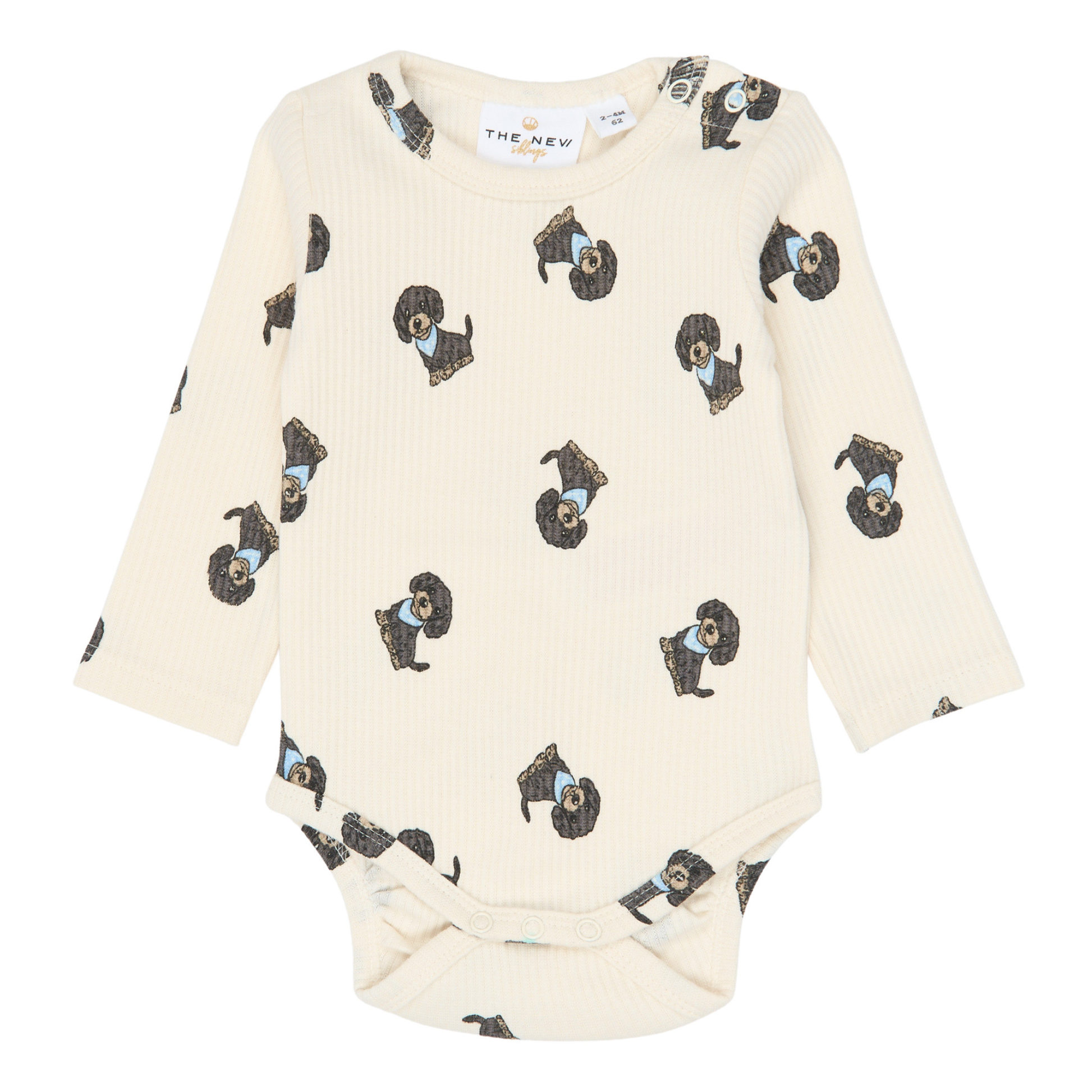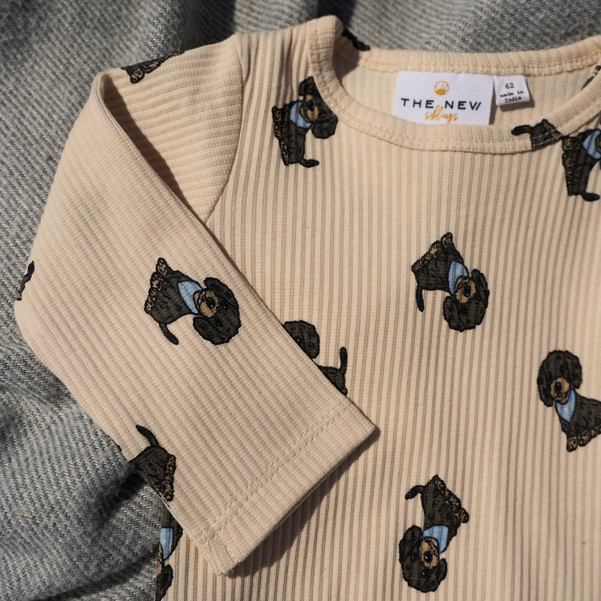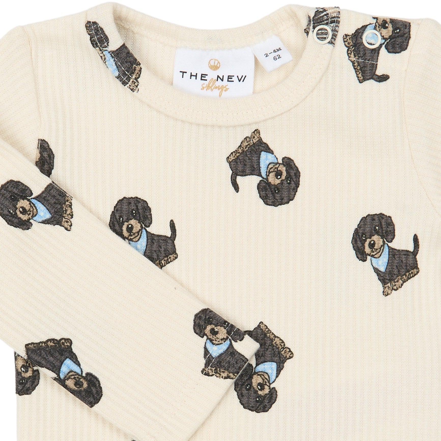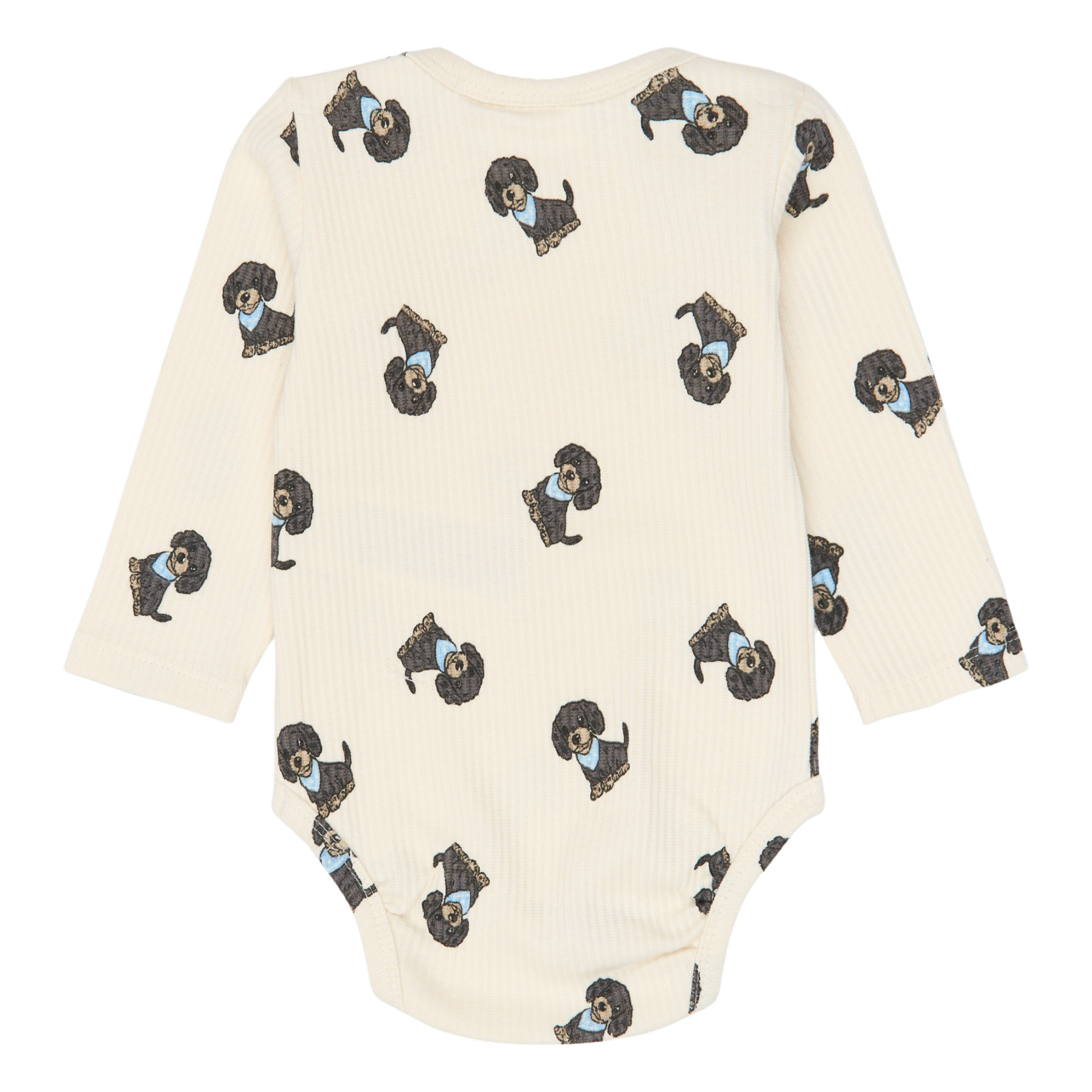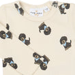 Denne i en fin råhvid farve med et sødt print over det hele af nuttede mørkegrå hunde med lyseblåt tørklæde.
