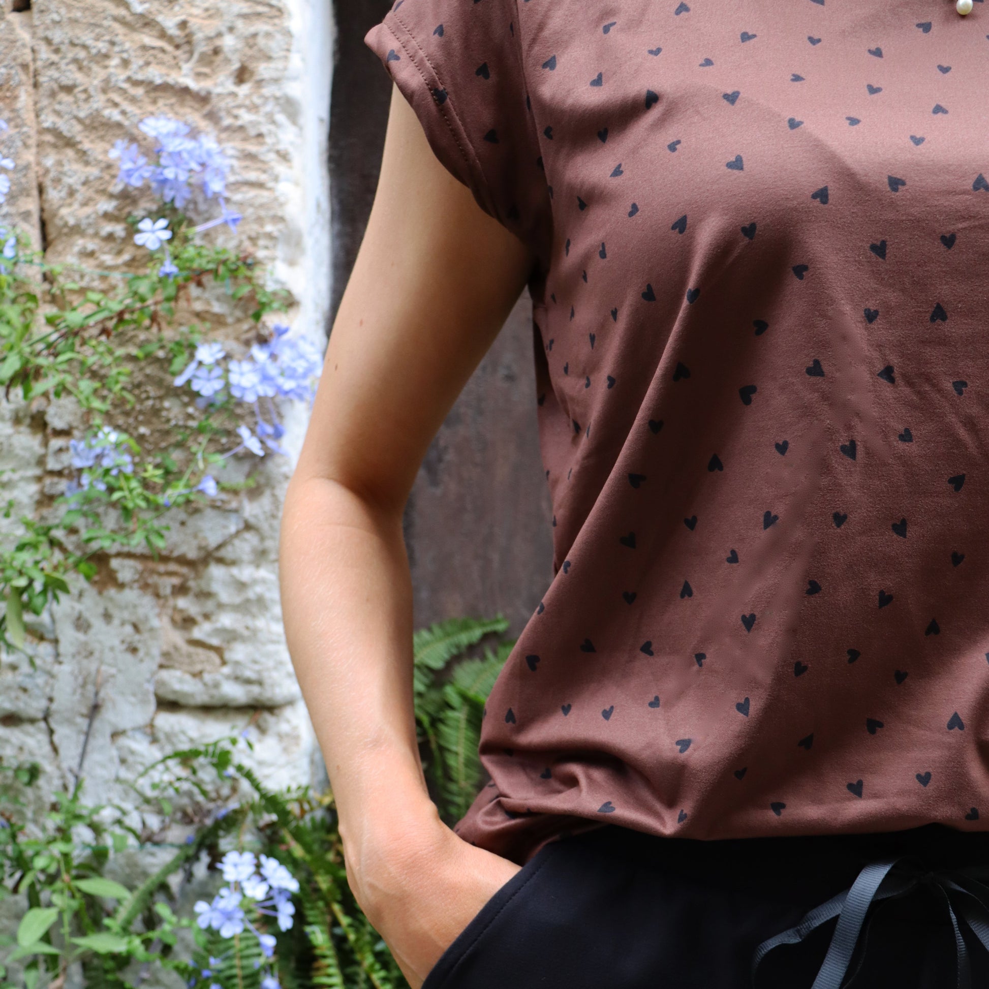 Denne i en flot brun farve med søde små hjerter i sort over det hele.