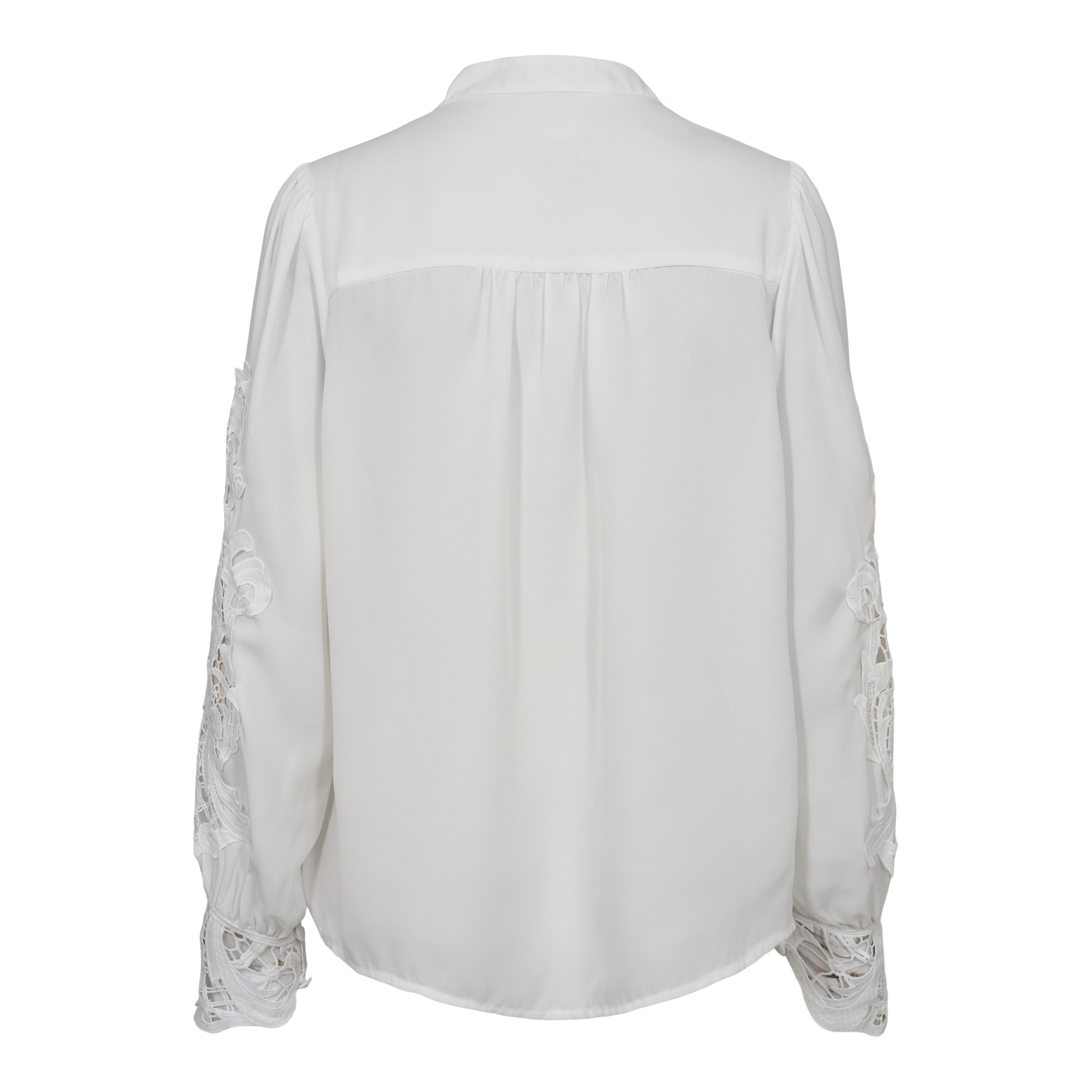 Denne i en klassisk hvid farve med et smukt blondemønster på ærmerne.