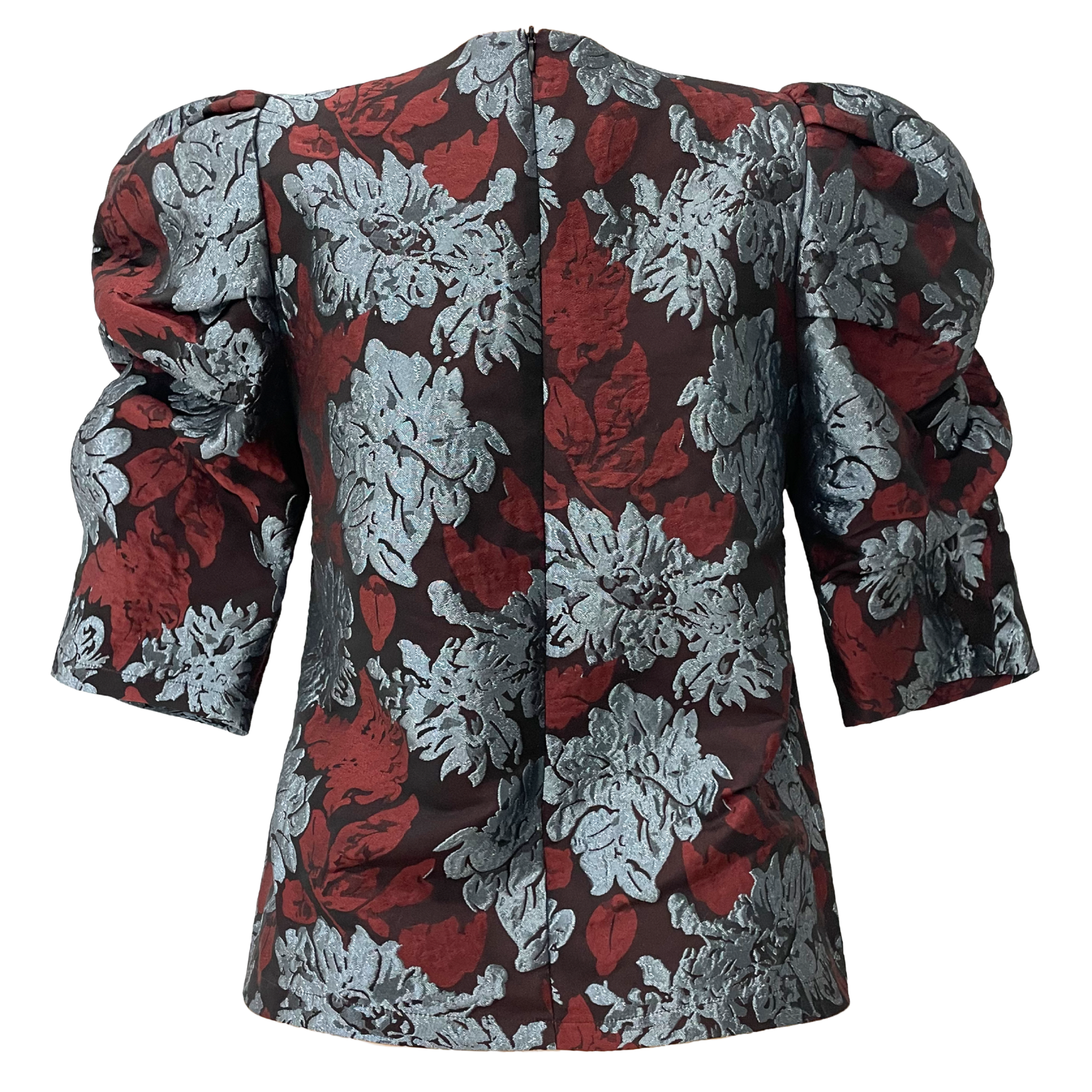 Blusen har rund hals og åbnes/lukkes i nakken med skjult lynlås.