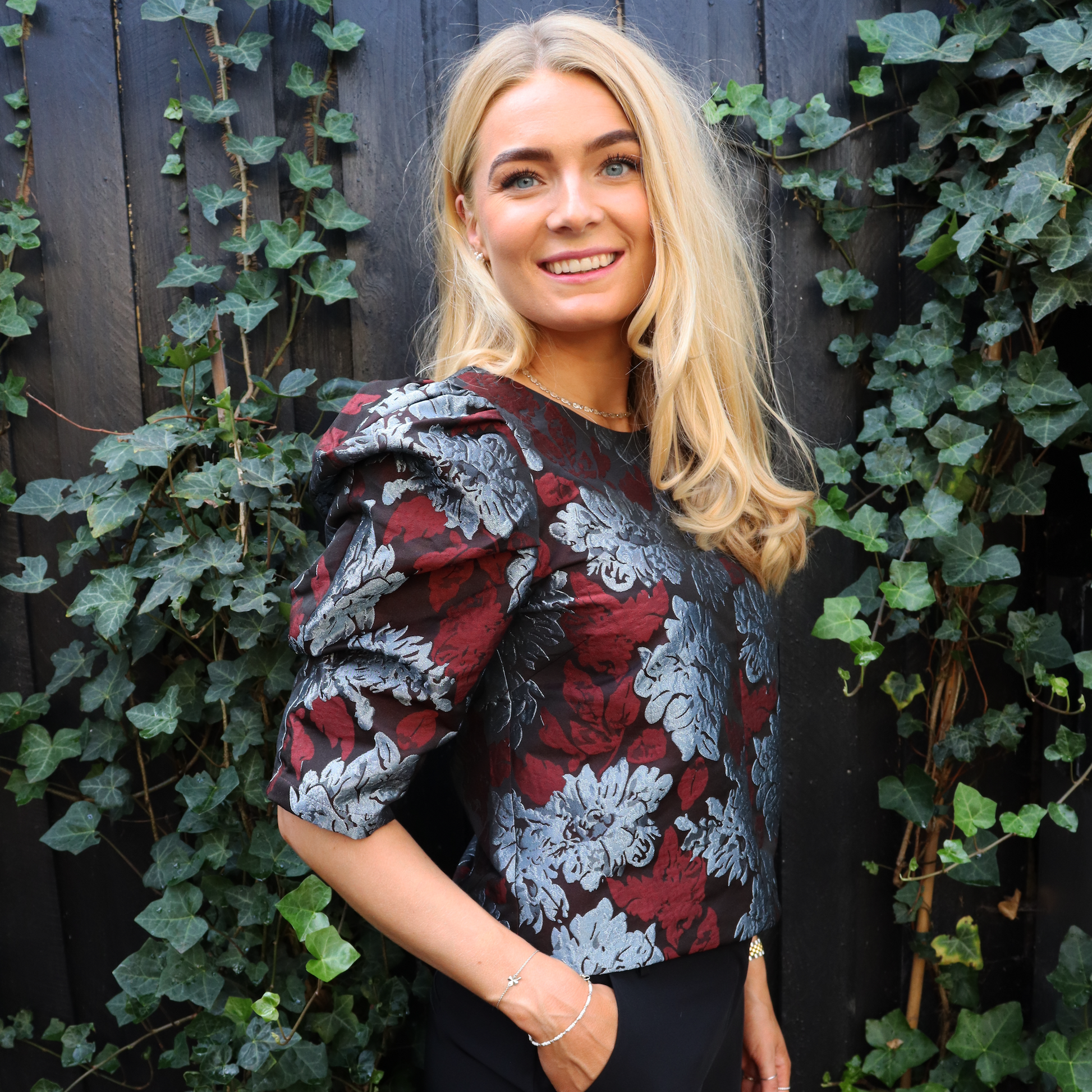 Denne i en flot bordeaux nuance med skønt brokade lignende mønster i bordeaux og sølv.