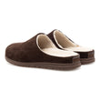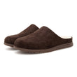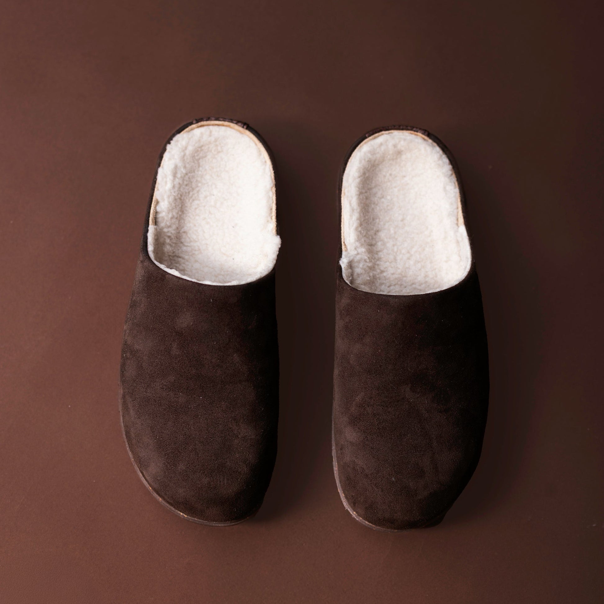 Denne i en flot mørk brun farve i ruskind med lyst foer.