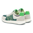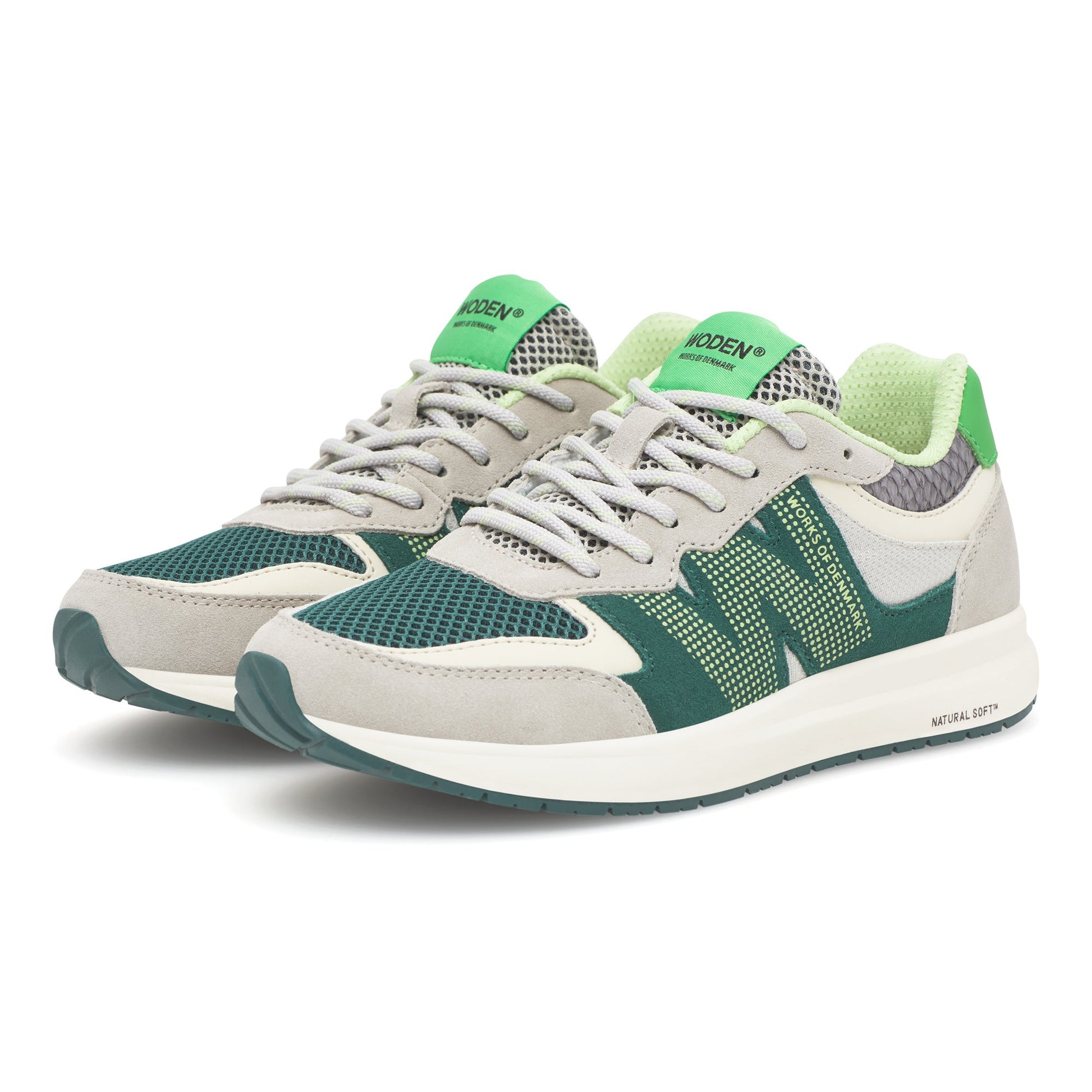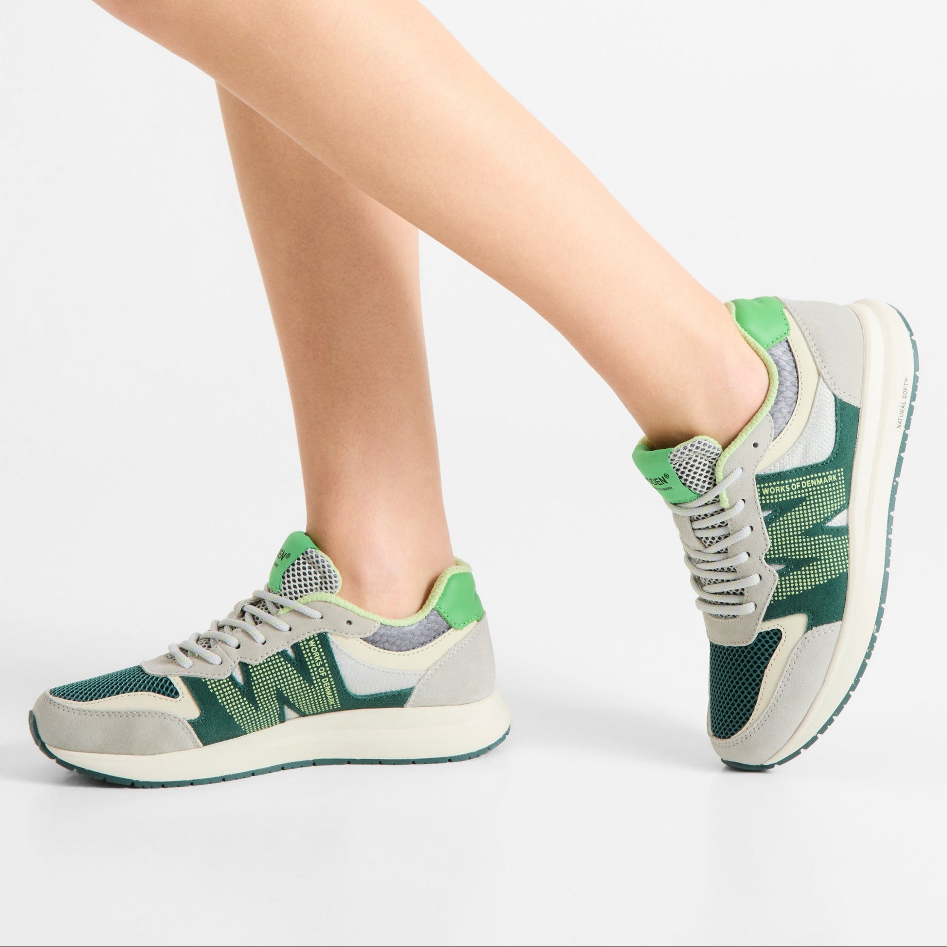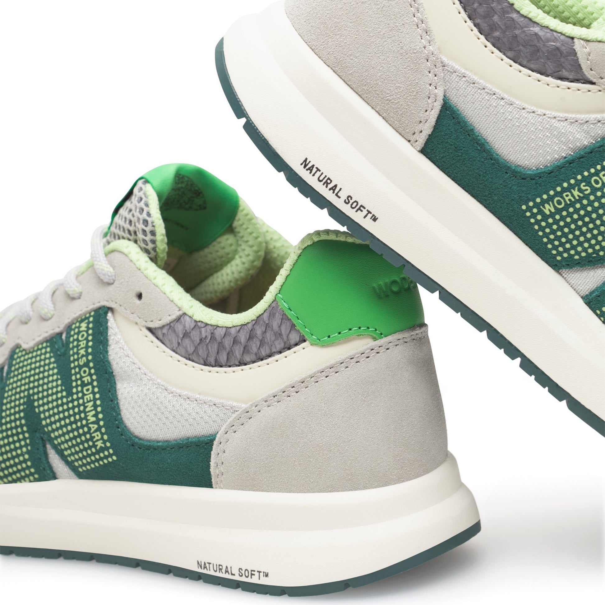 Denne i en flot lys grå tekstil med grå og mørk grøn ruskind, sort, mørk grøn og lys grå mesh på forfod og pløsen, detaljer på siden, pløsen og hælen i en flot æblegrøn samt detaljer i hvid refleks, mørk grå fiskeskind, lys limegrøn inderside samt råhvid og mørk grøn sål udvendigt.