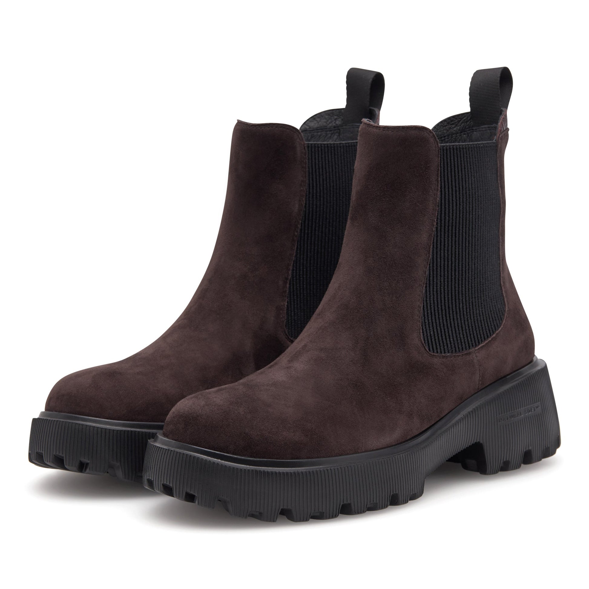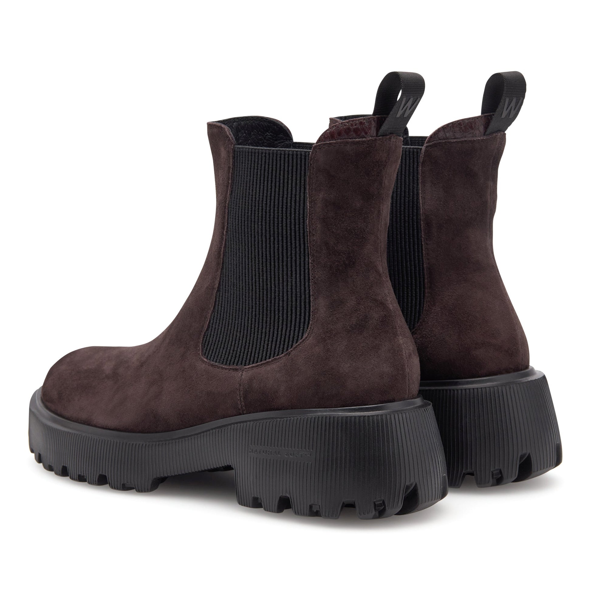 Denne i en flot dyb chokoladebrun farve i ruskind, med en fin detalje øverst i skaftet med tone-i-tone fiskesind, sort elastik i siderne samt sort gummisål.