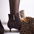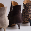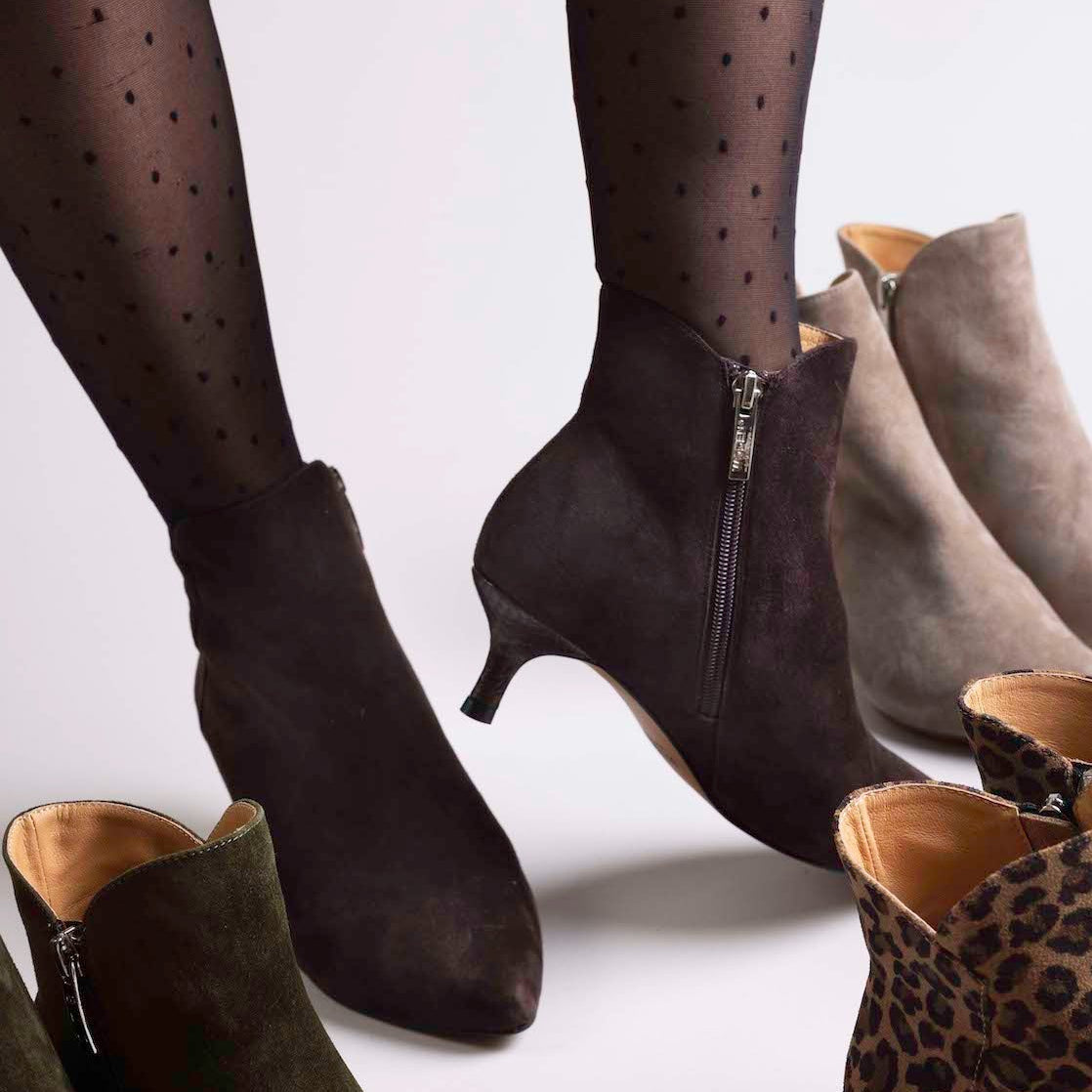 Denne i en flot mørk brun i ruskind med detaljer i tone-i-tone fiskeskind på hælen.