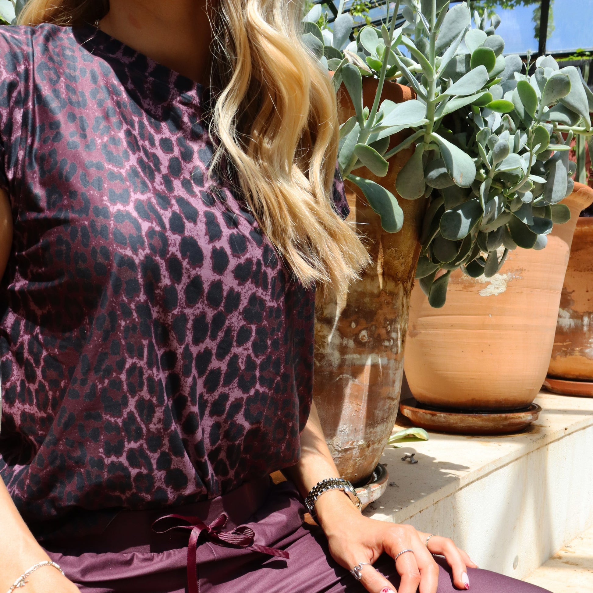Denne i et skønt leopardmønster i mørk bordeaux, lys bordeaux og sort.