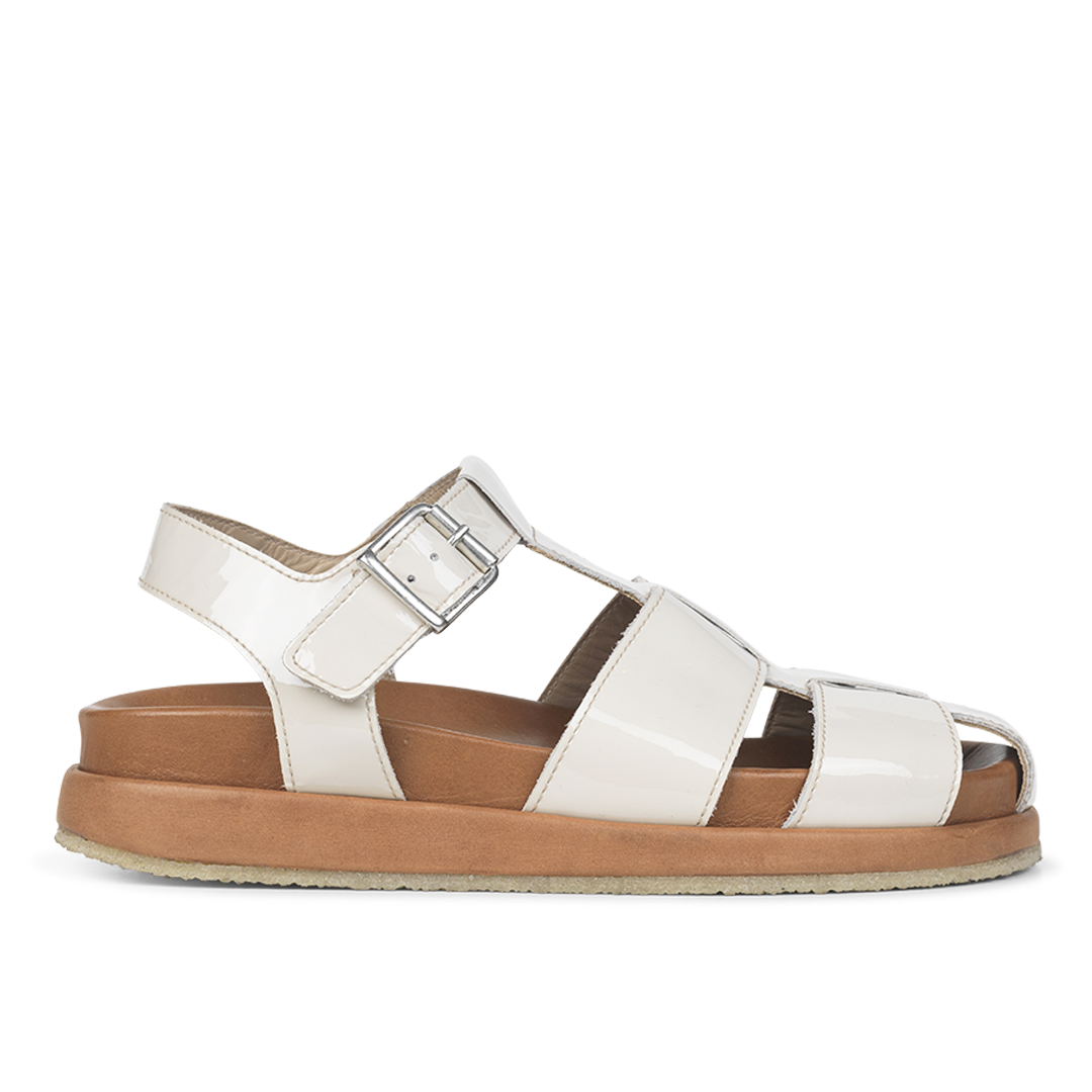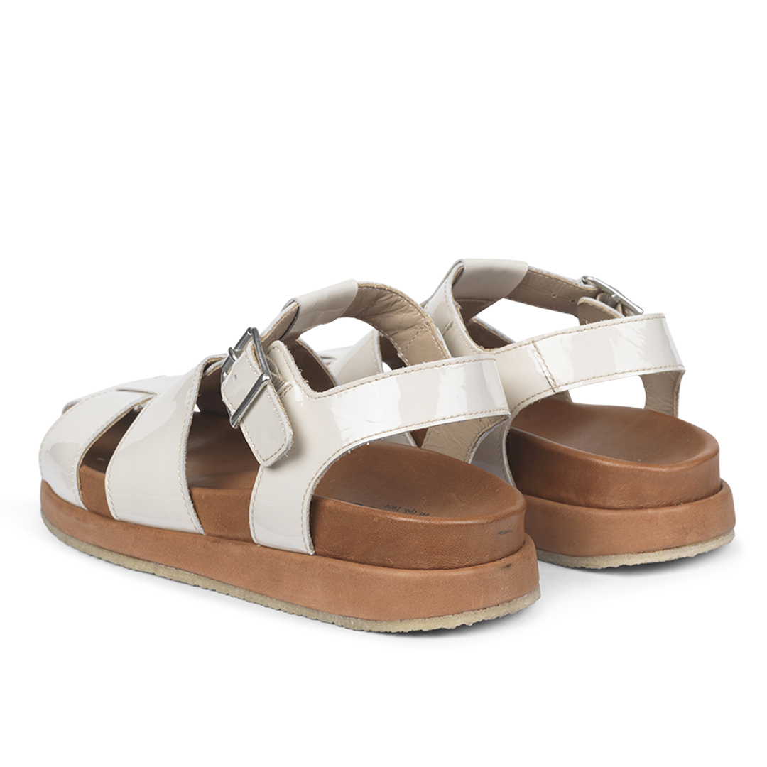 Denne i en flot råhvid læder med lak med lys brun sål.