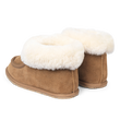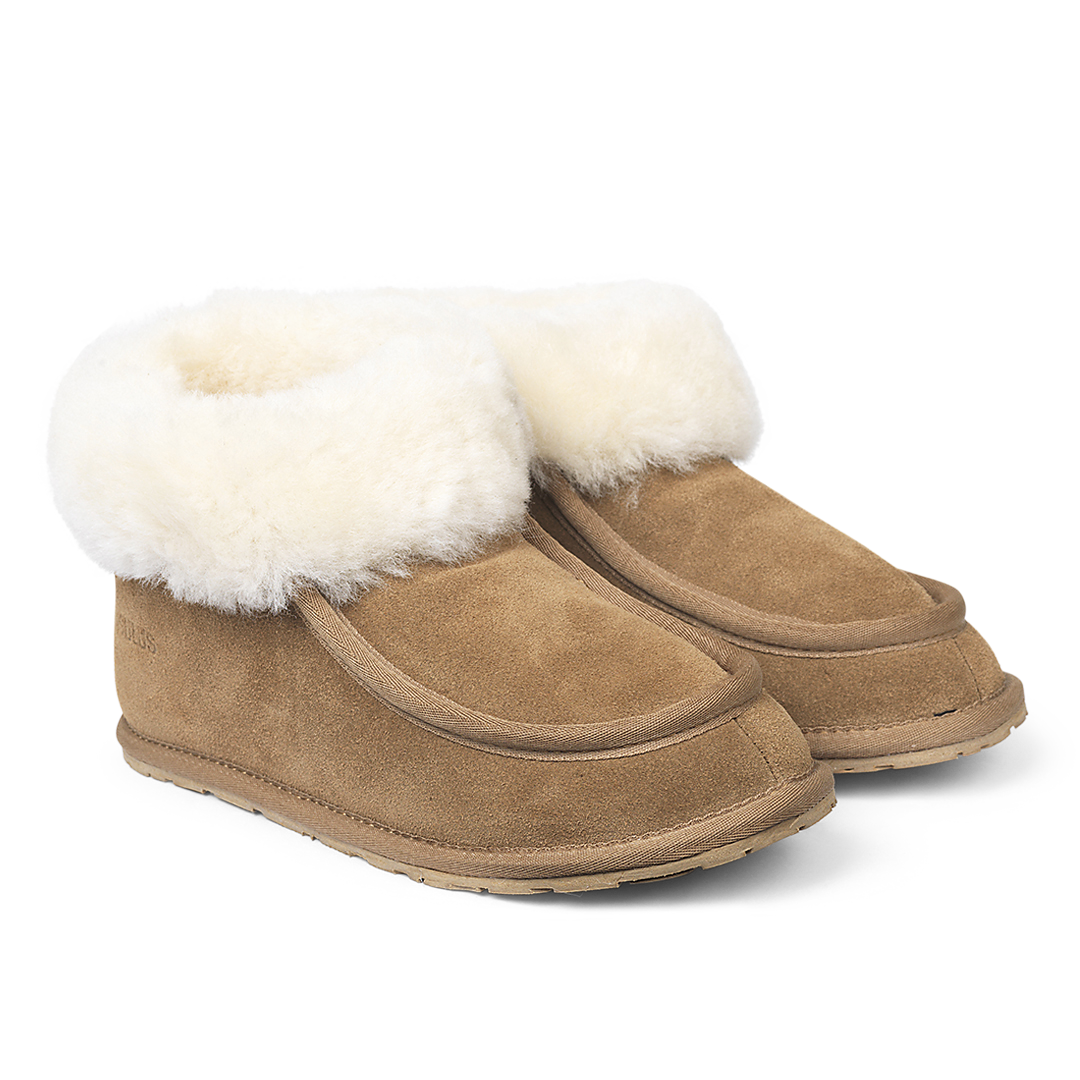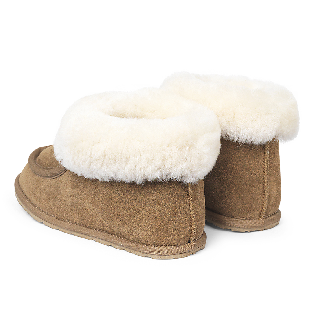 Disse i en flot mørk sand farve i ruskind udvendigt med blødt lyst lammeuld indvendigt.