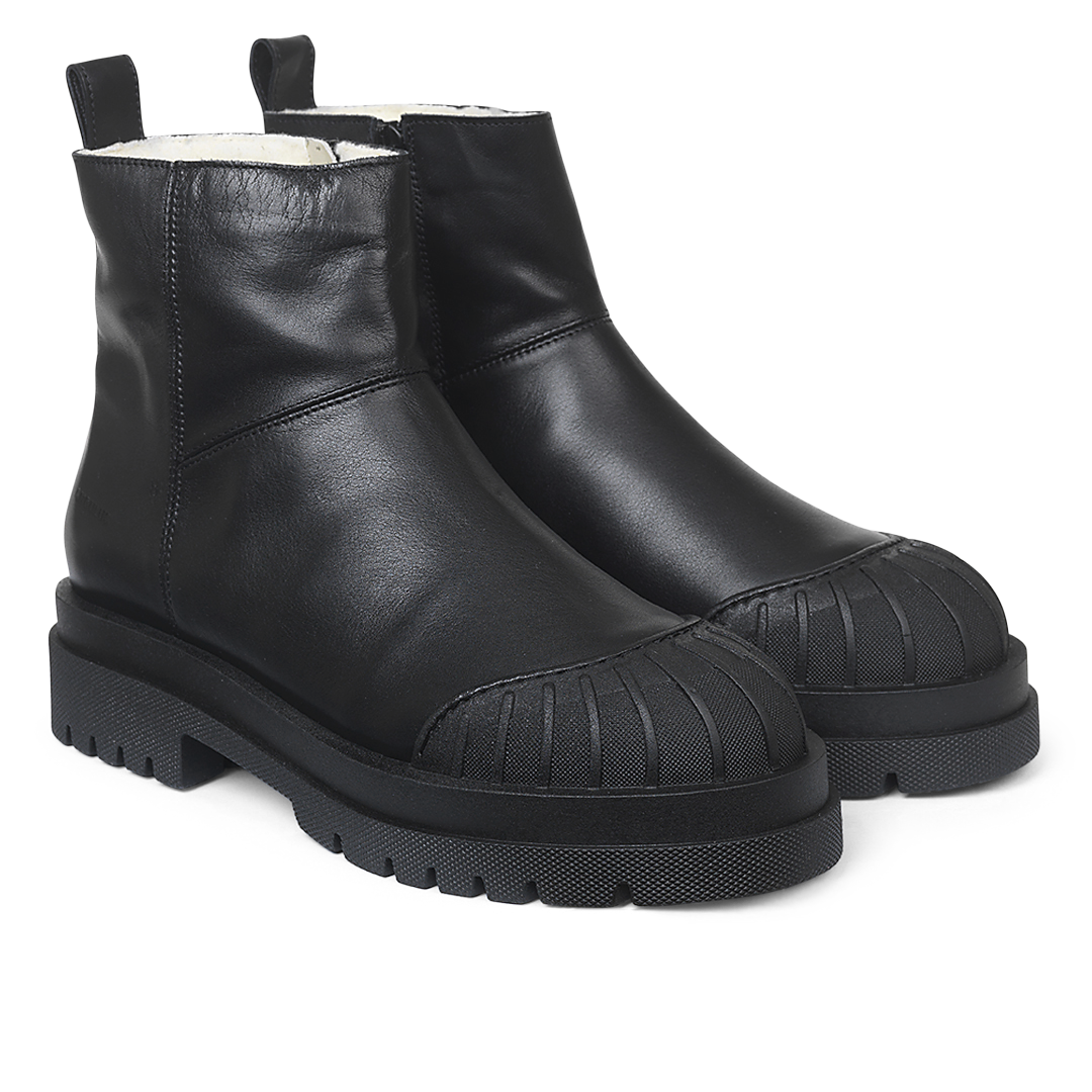 Denne i sort læder med lyst uldfoer og sort gummisnude og -sål