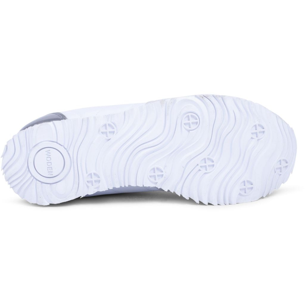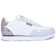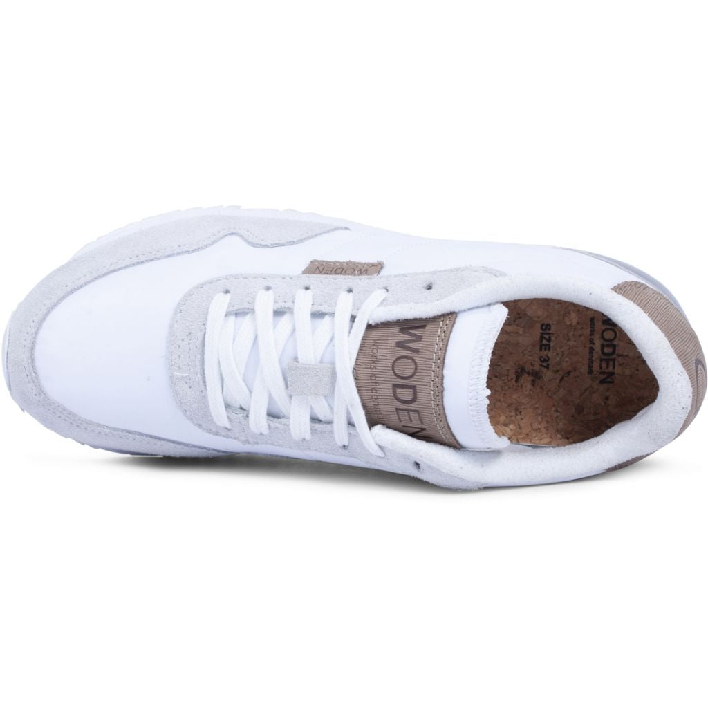 Denne i en flot hvid farve i nylonstof med ruskinds detaljer og sølv/metallic hælkap.