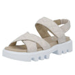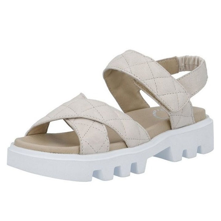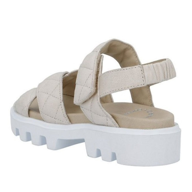 Sandalen har to kryds-remme over forfoden, en ram om hælen med elastik og en justerbar rem med velcro over vristen for den perfekte pasform.